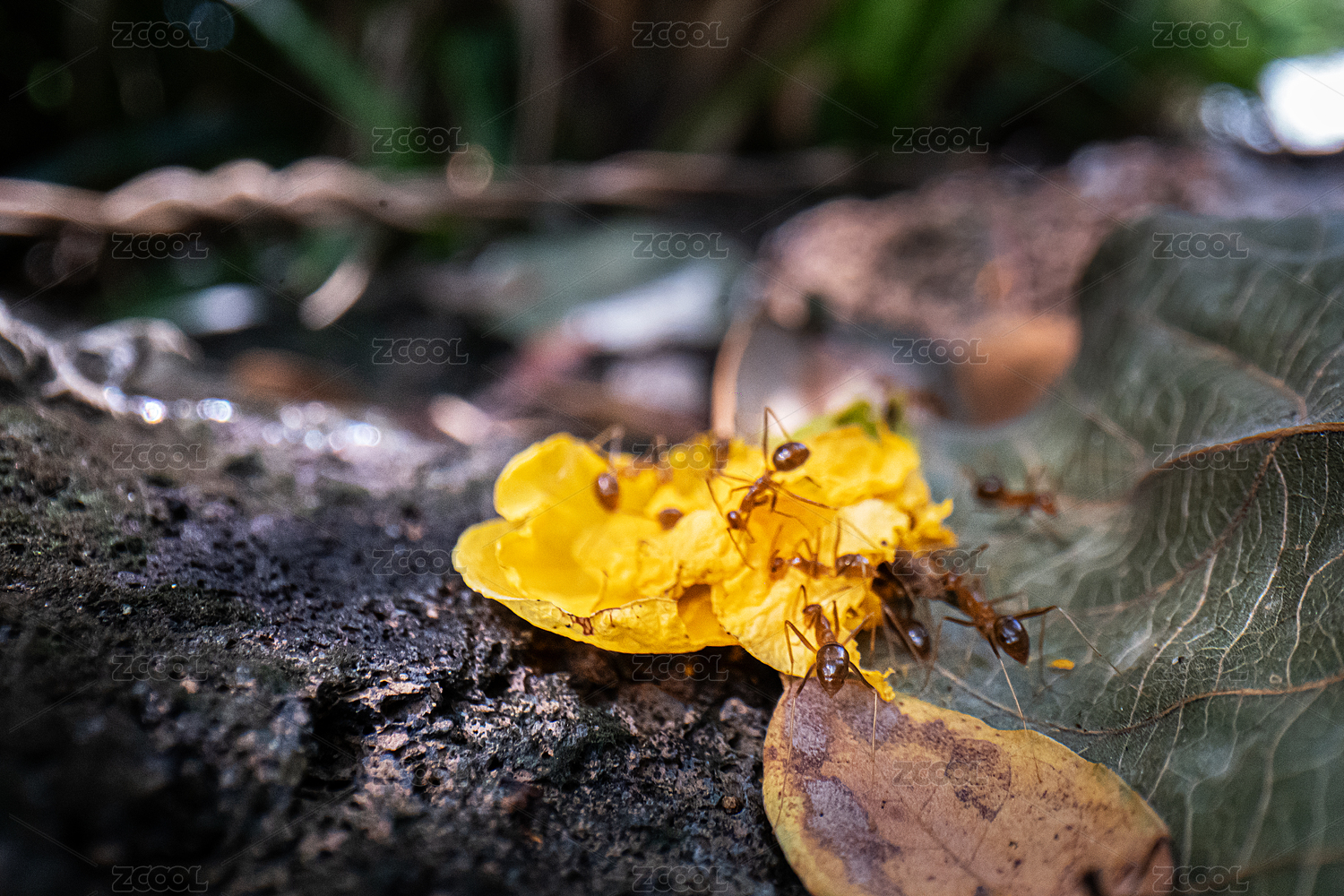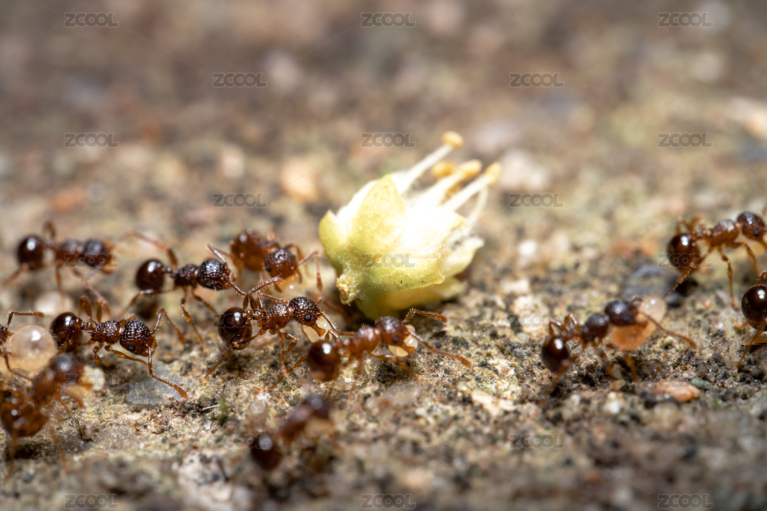 一群在地上捕食的黄色蚂蚁