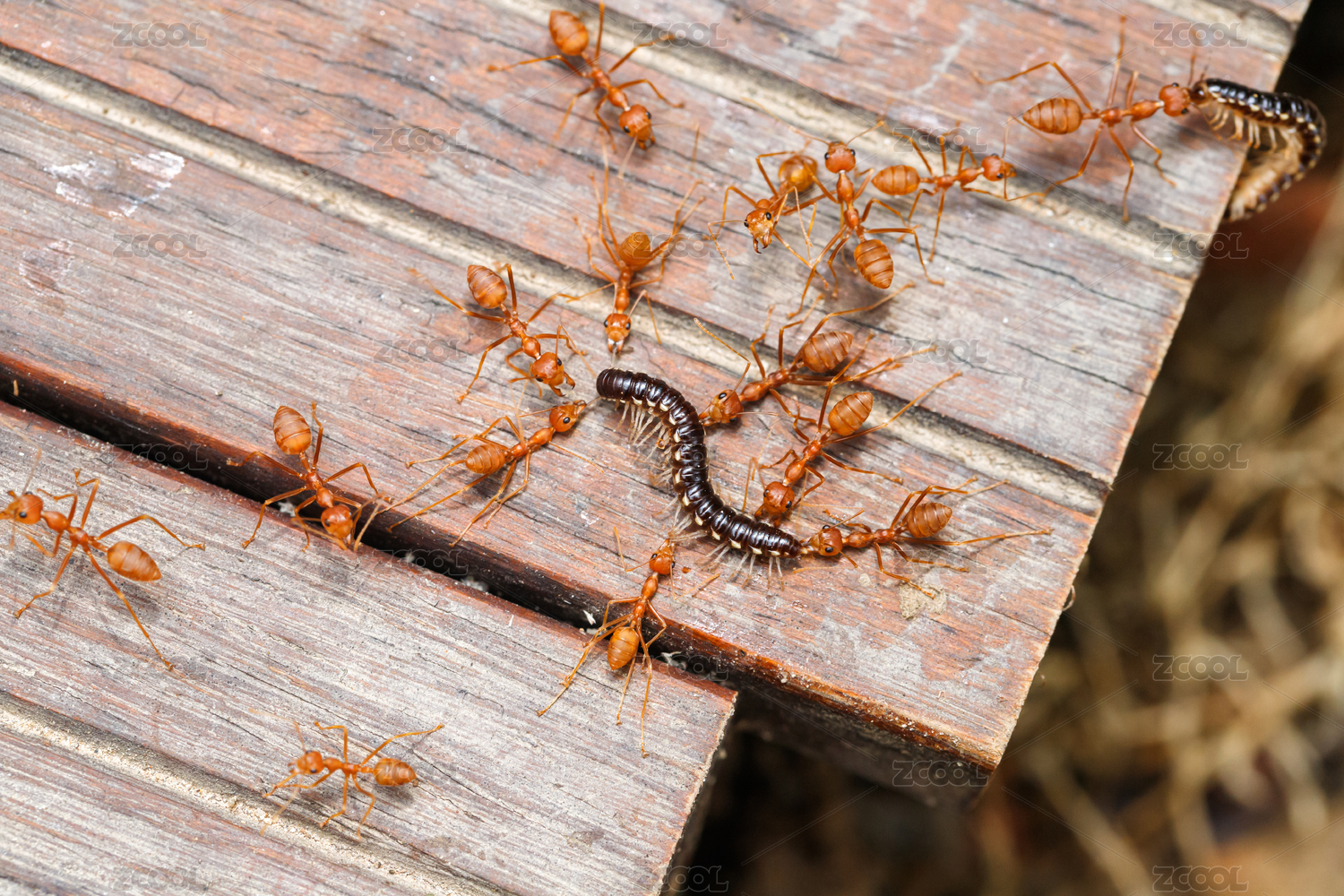 木板上正在捕食的一群红色蚂蚁
