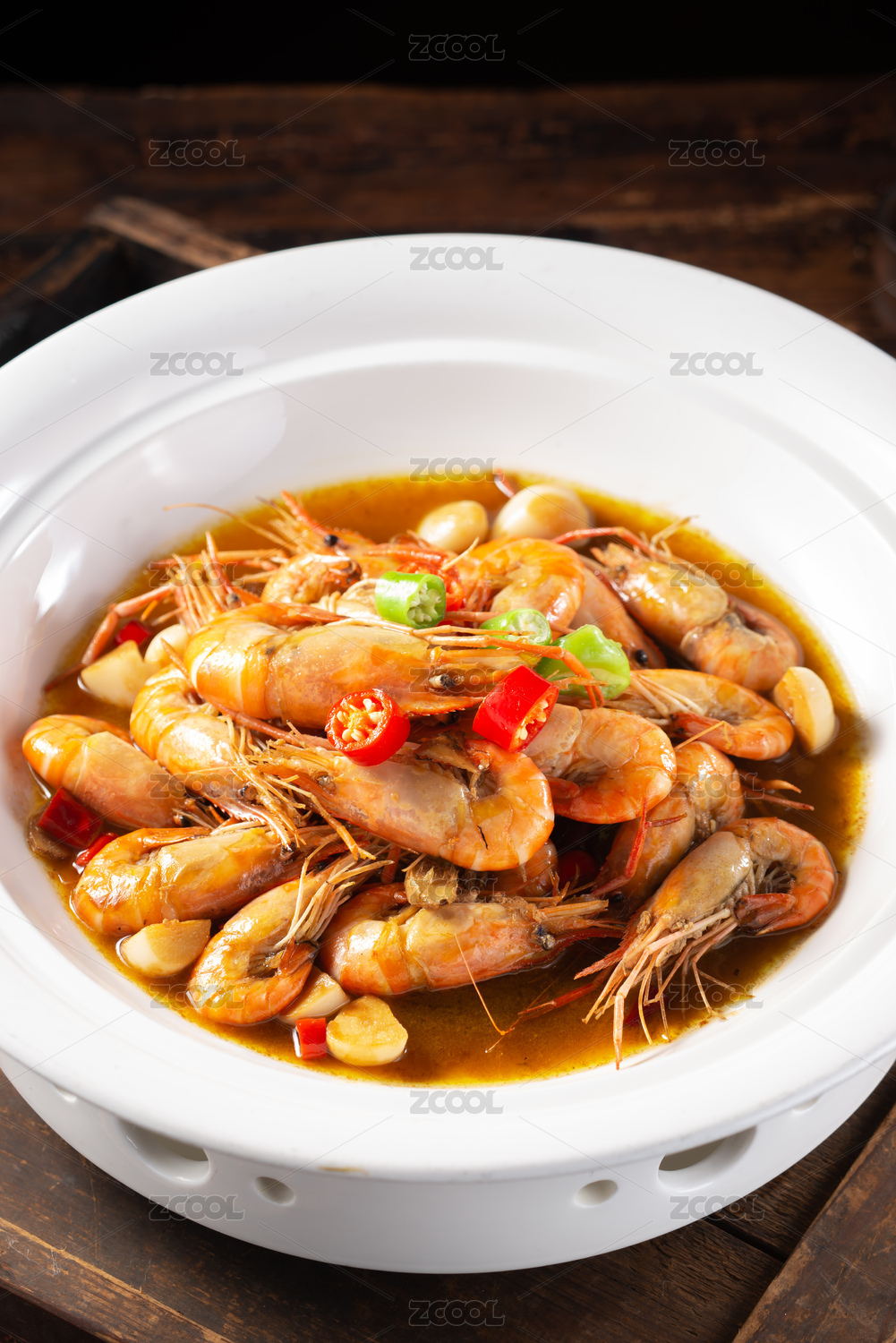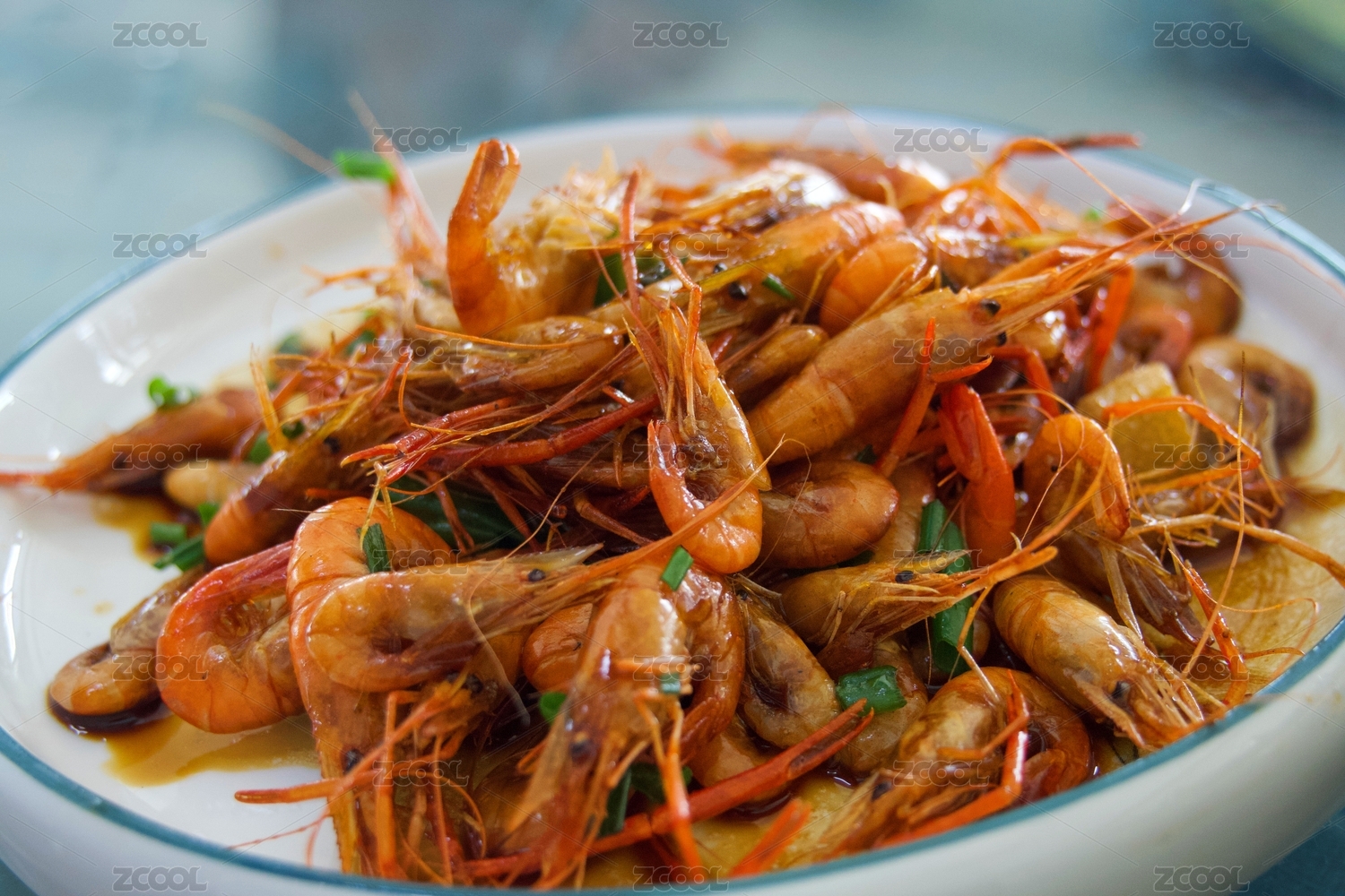 桌上碗里的油爆河虾的特写镜头