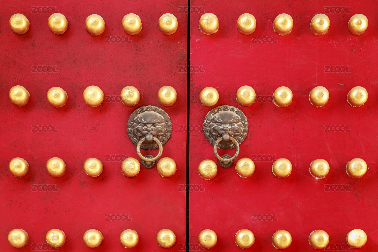古代铜乳钉虎头辅首的朱红宫门,中国江苏省南京市明孝陵古建筑大门