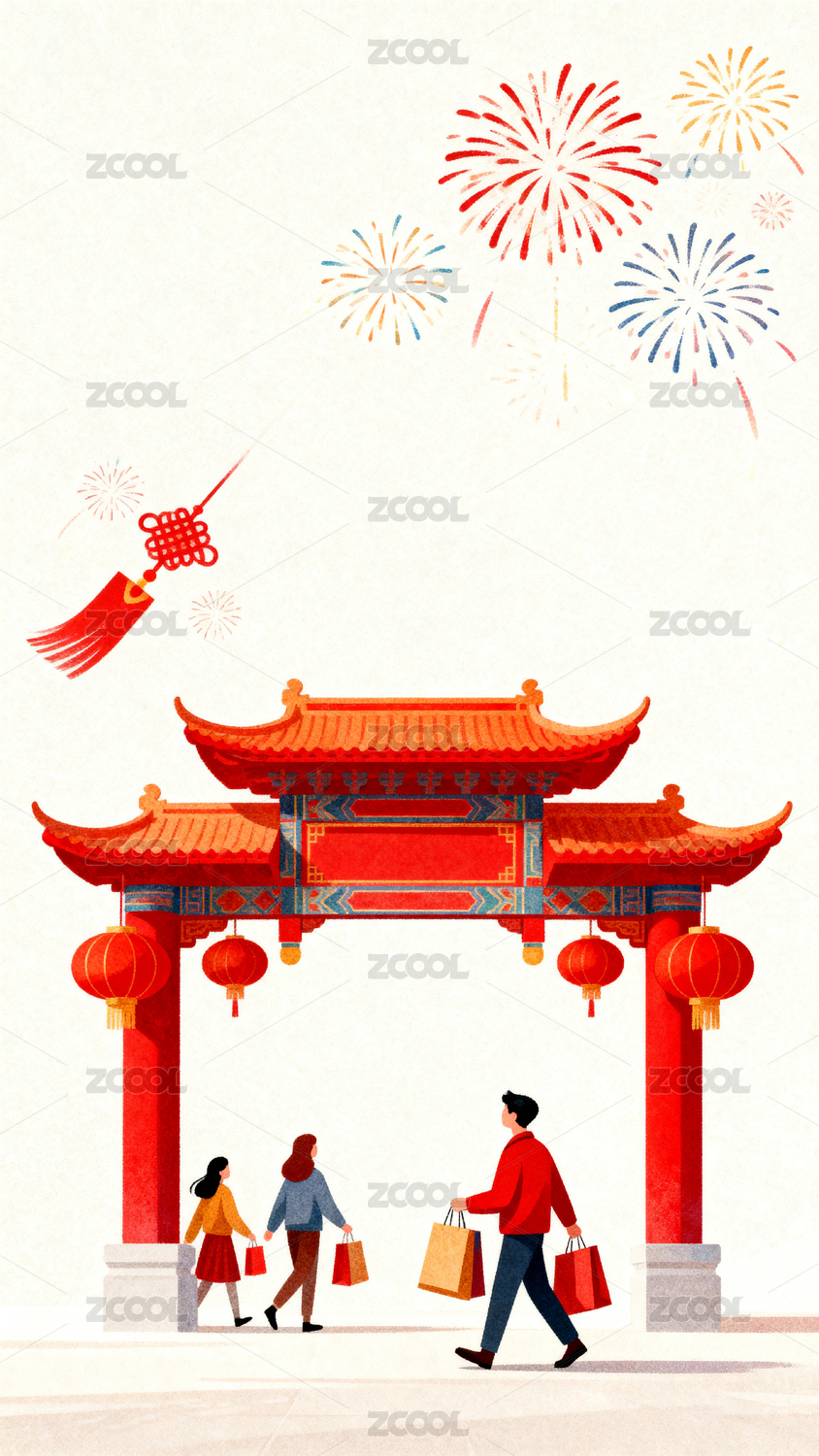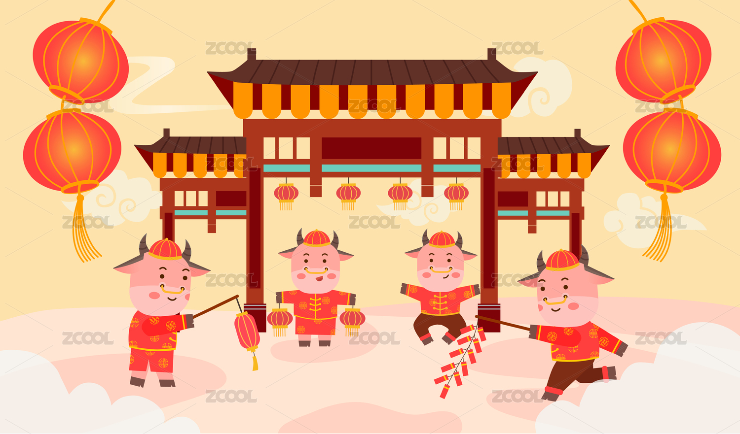 新年可爱中式牌楼伴随金元宝和鞭炮