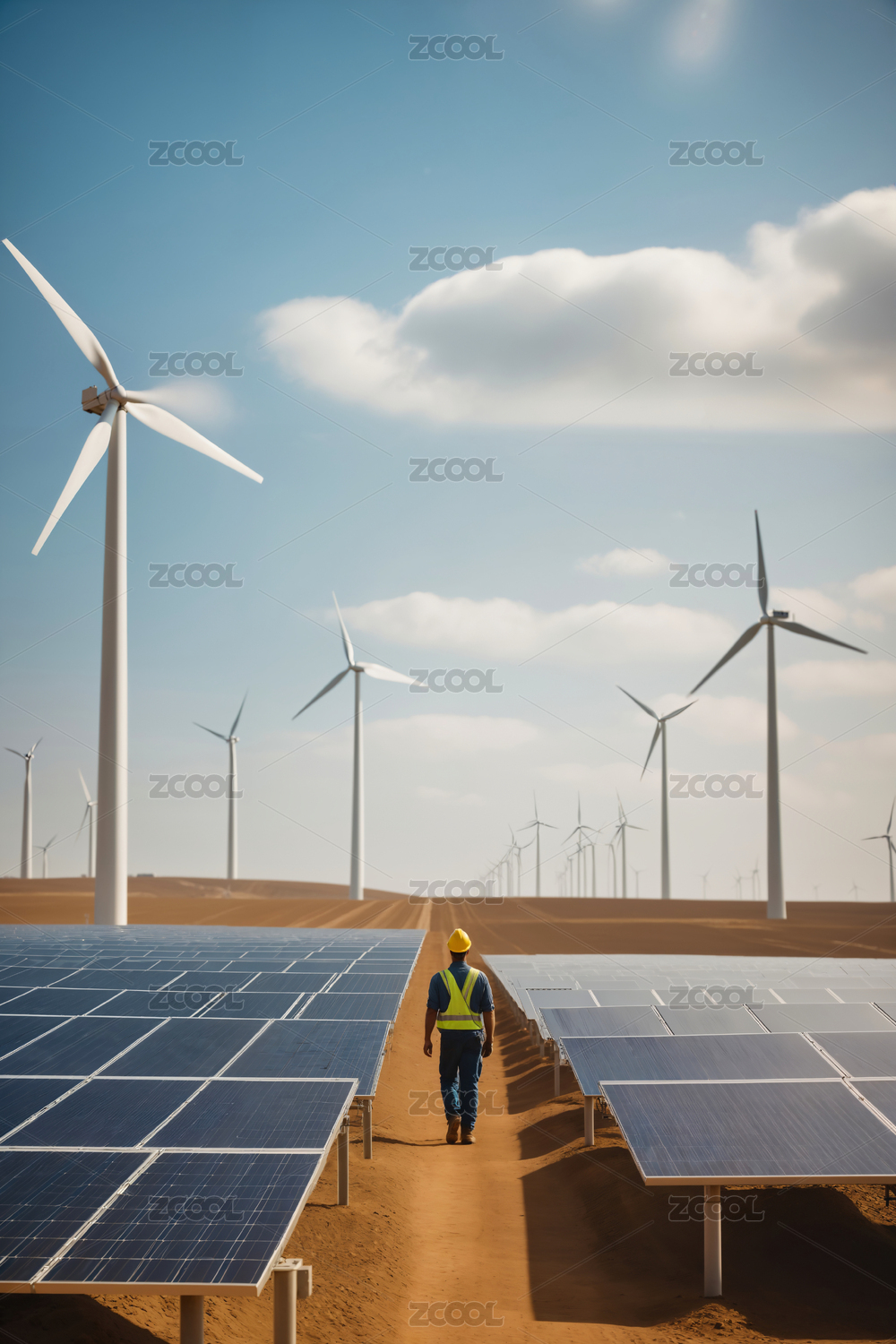 太阳能板风力发电机蓝天背景