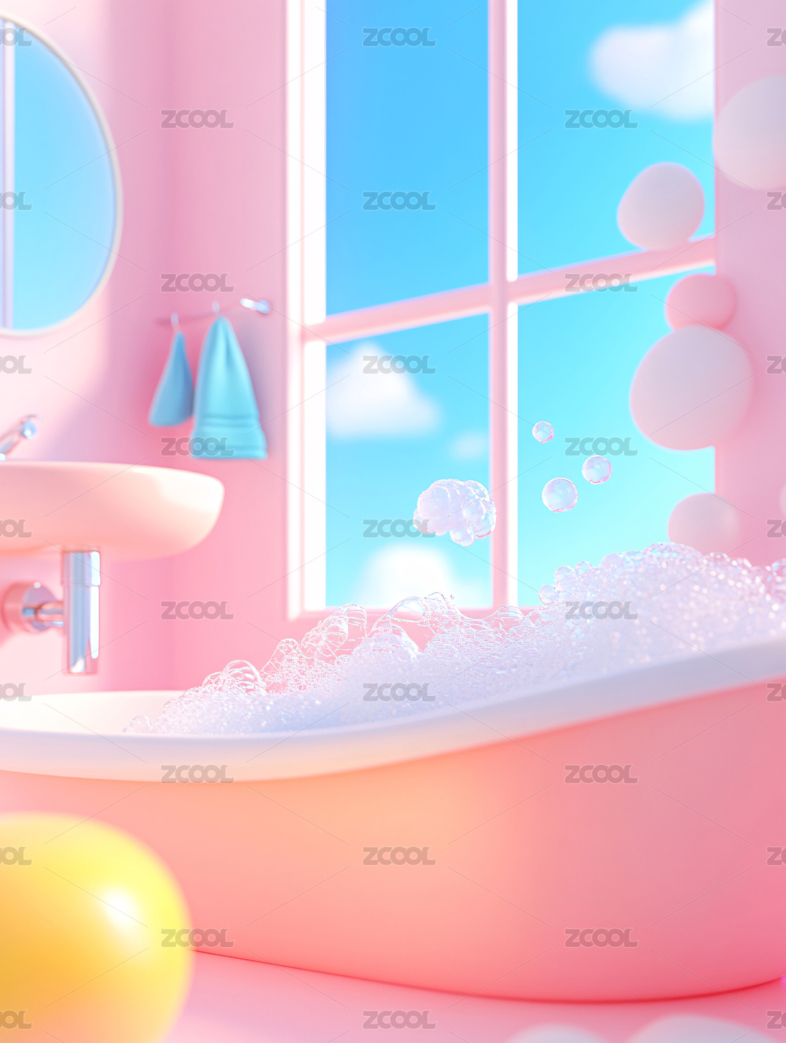 卡通笑脸球与清新浴室背景