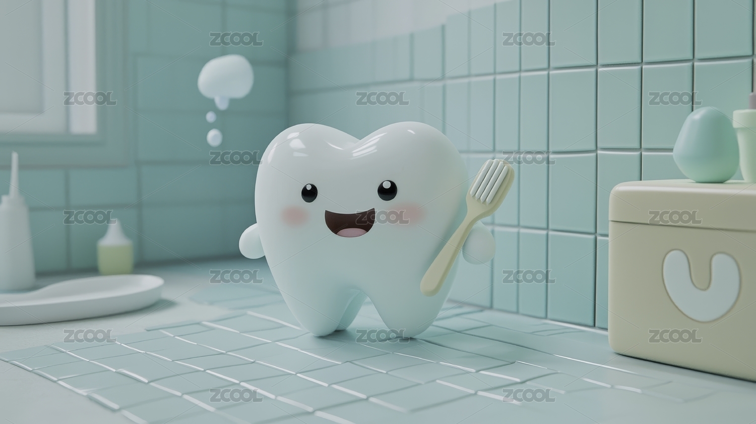 清新浴室中笑脸牙爱护牙齿形象小朋友电商