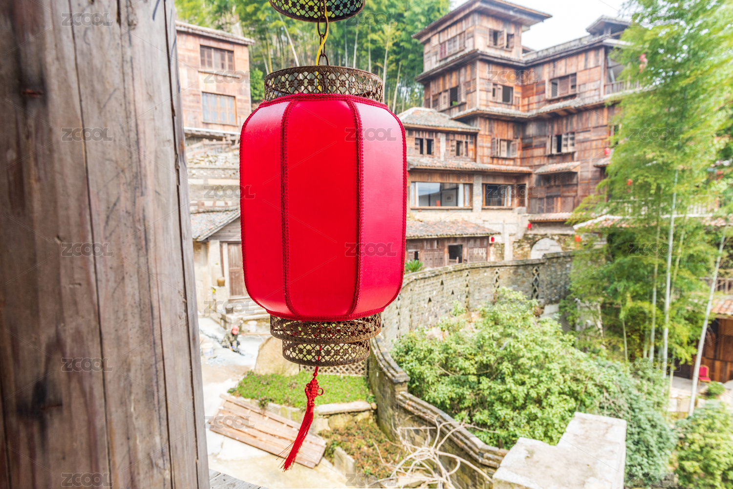 中国新年,屋檐下悬挂着红色的灯笼,民宿酒店