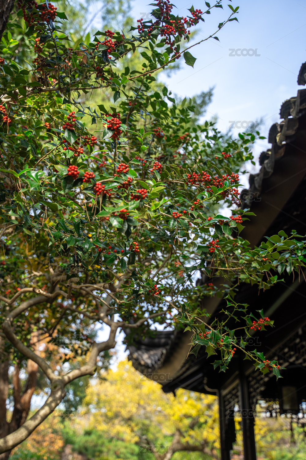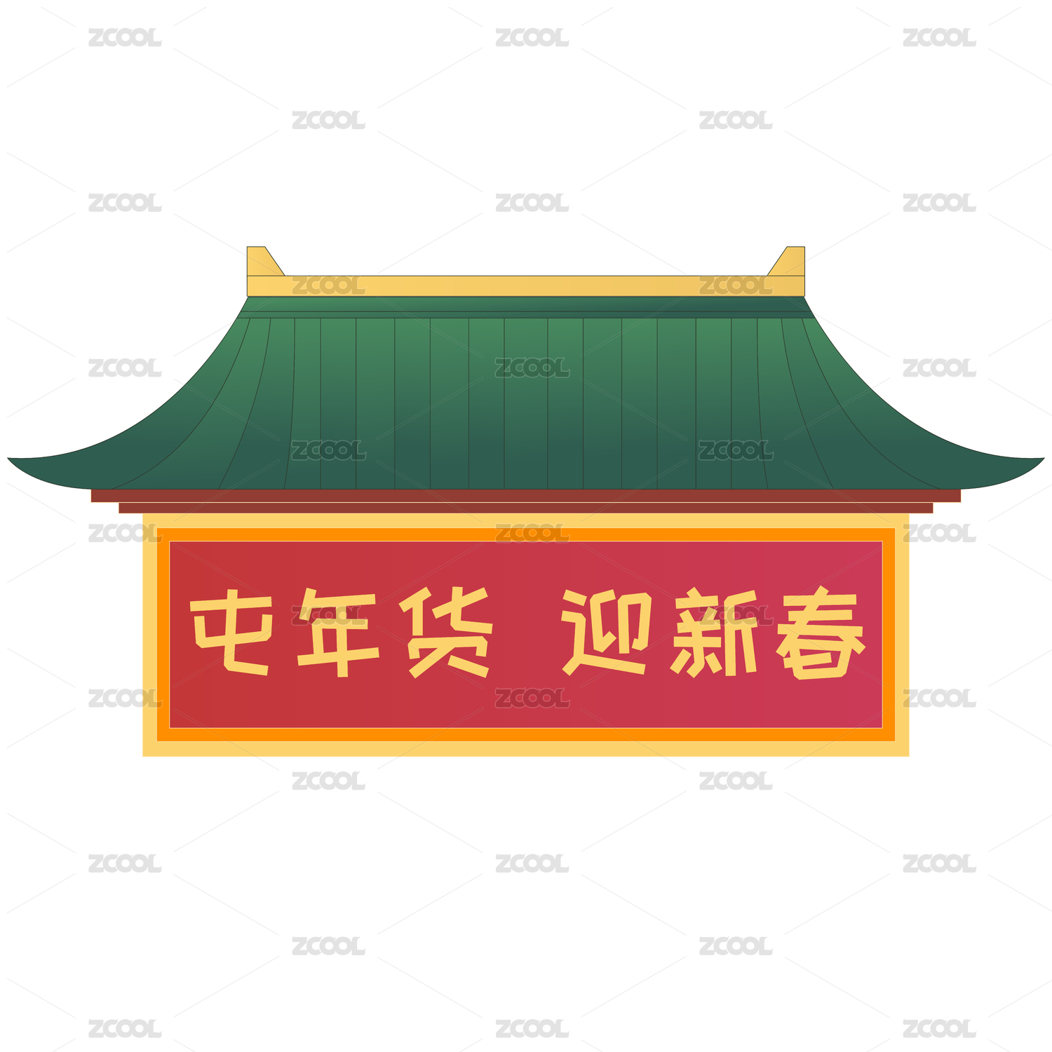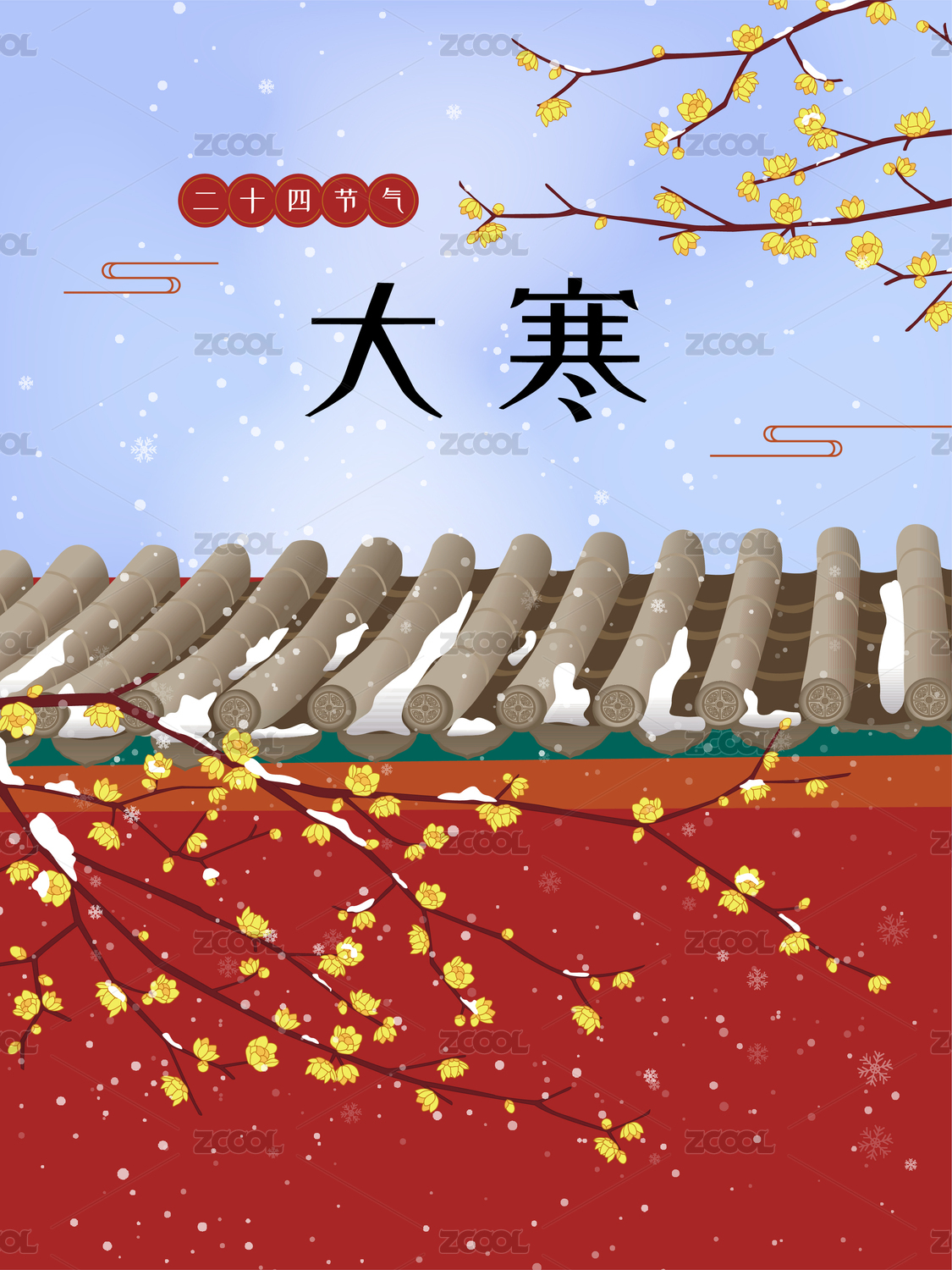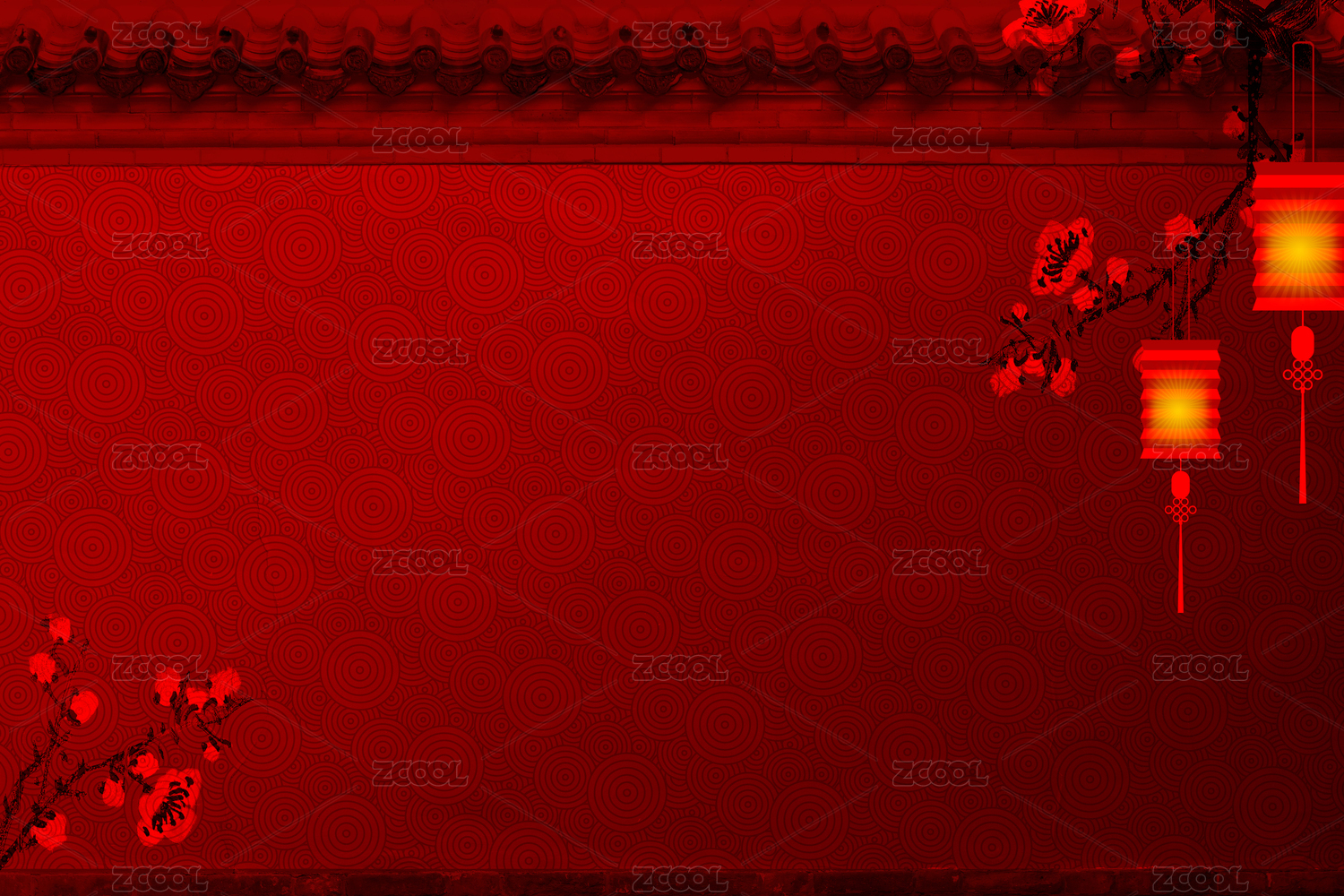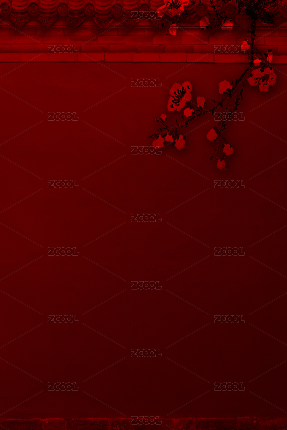 暗红色屋檐、墙、梅花、梅花枝、灯笼、祥纹,构建的中国风纹理背景