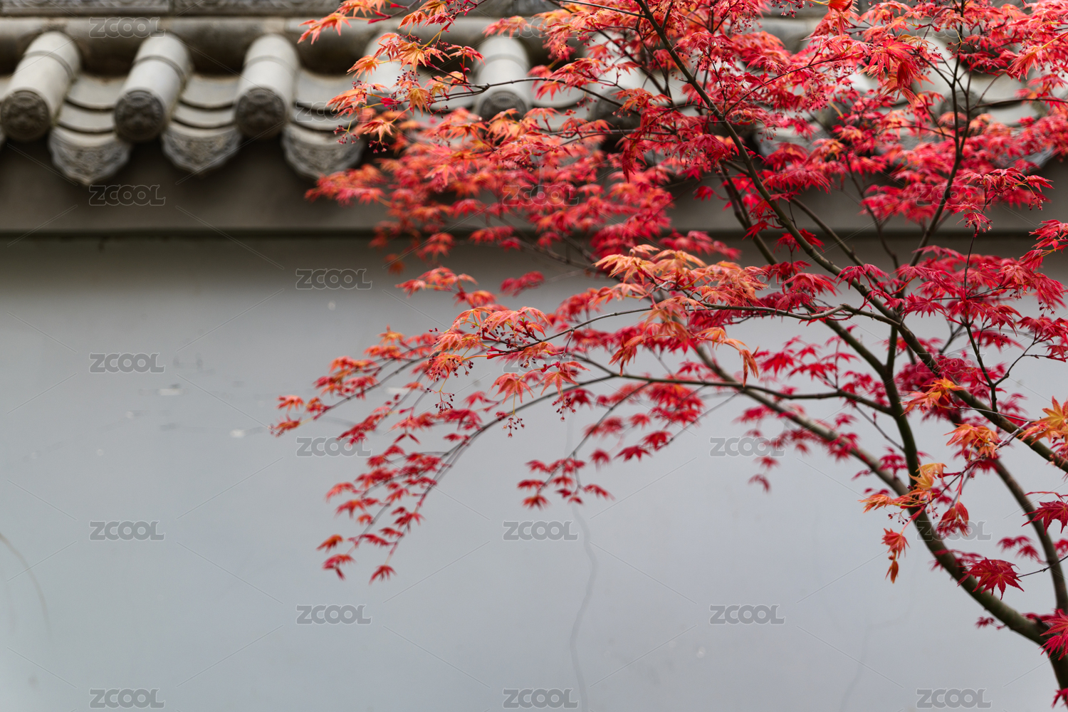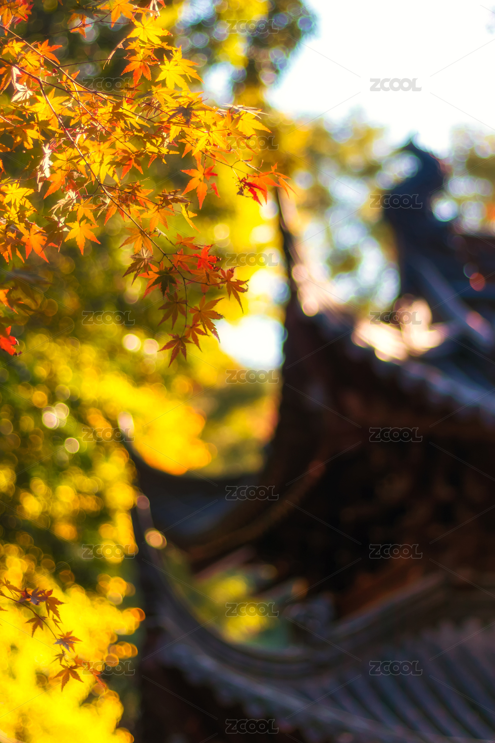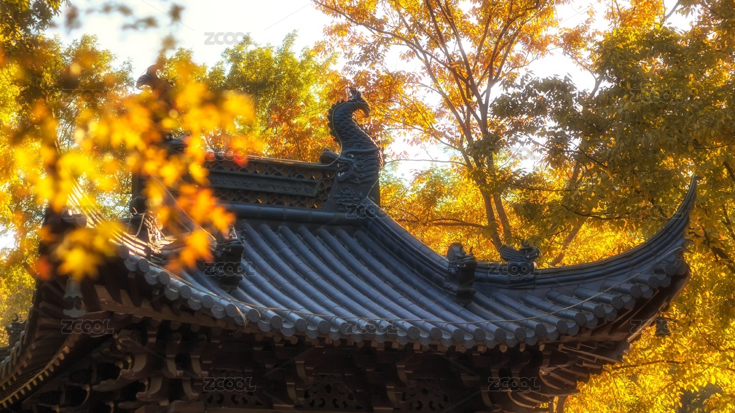 秋季红色枫叶黄色银杏叶与古建筑屋檐美景,中国江苏省南京市栖霞山栖霞寺