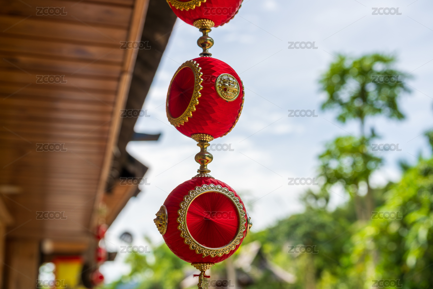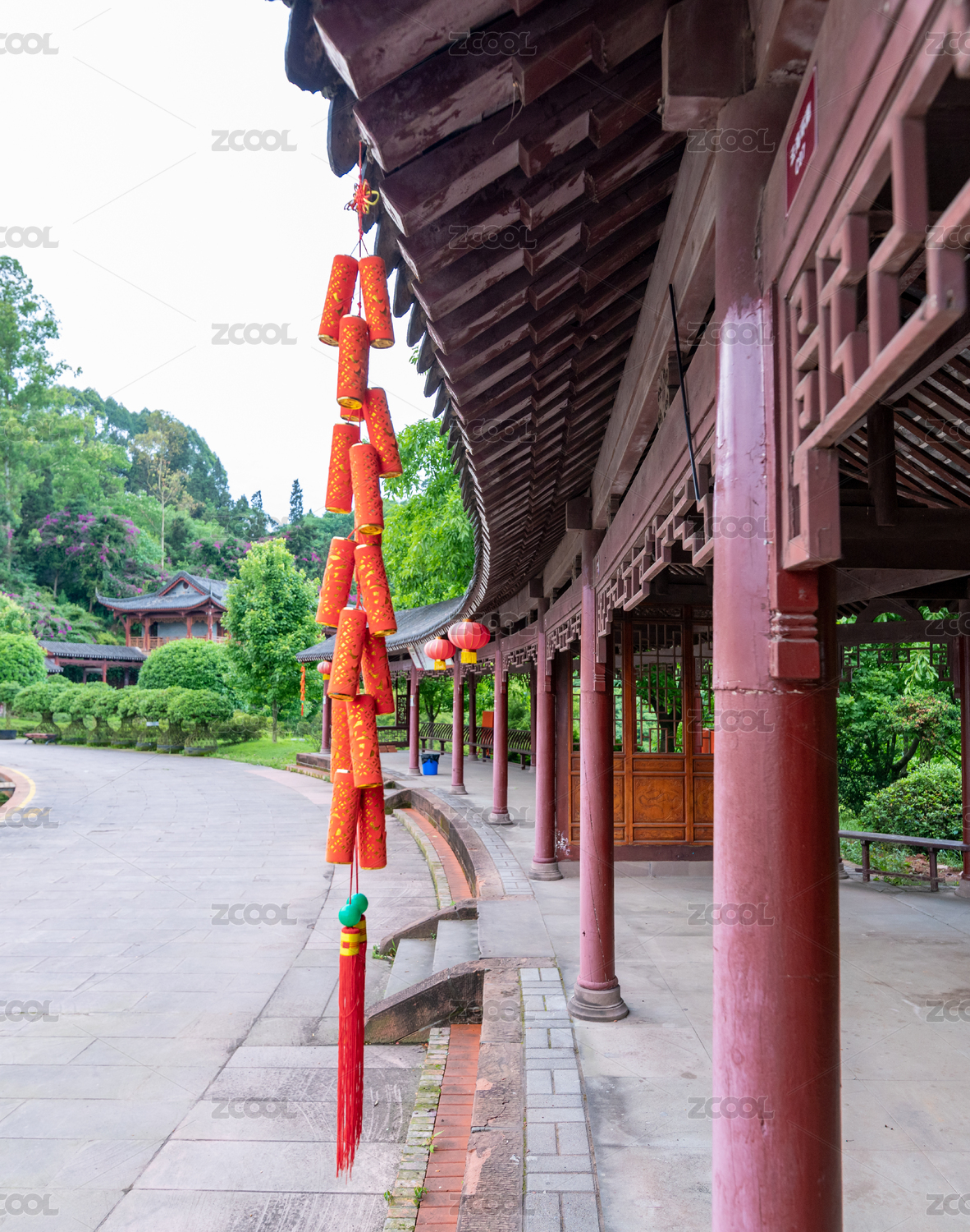 悬挂在古建筑屋檐上的红色鞭炮景观