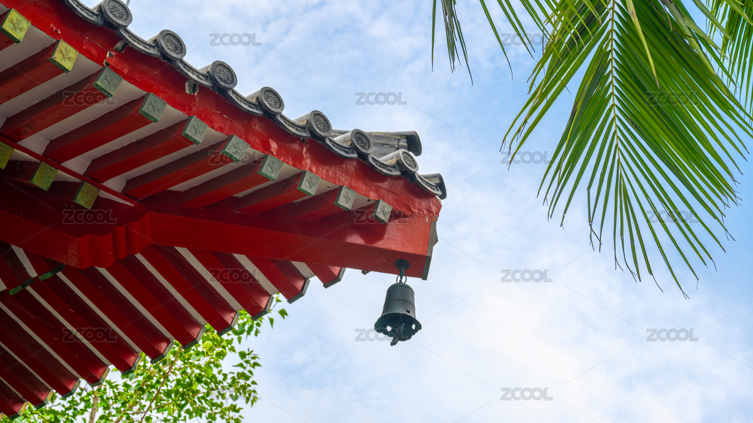 海南三亚南山景区南山寺红色屋檐铃铛椰子树