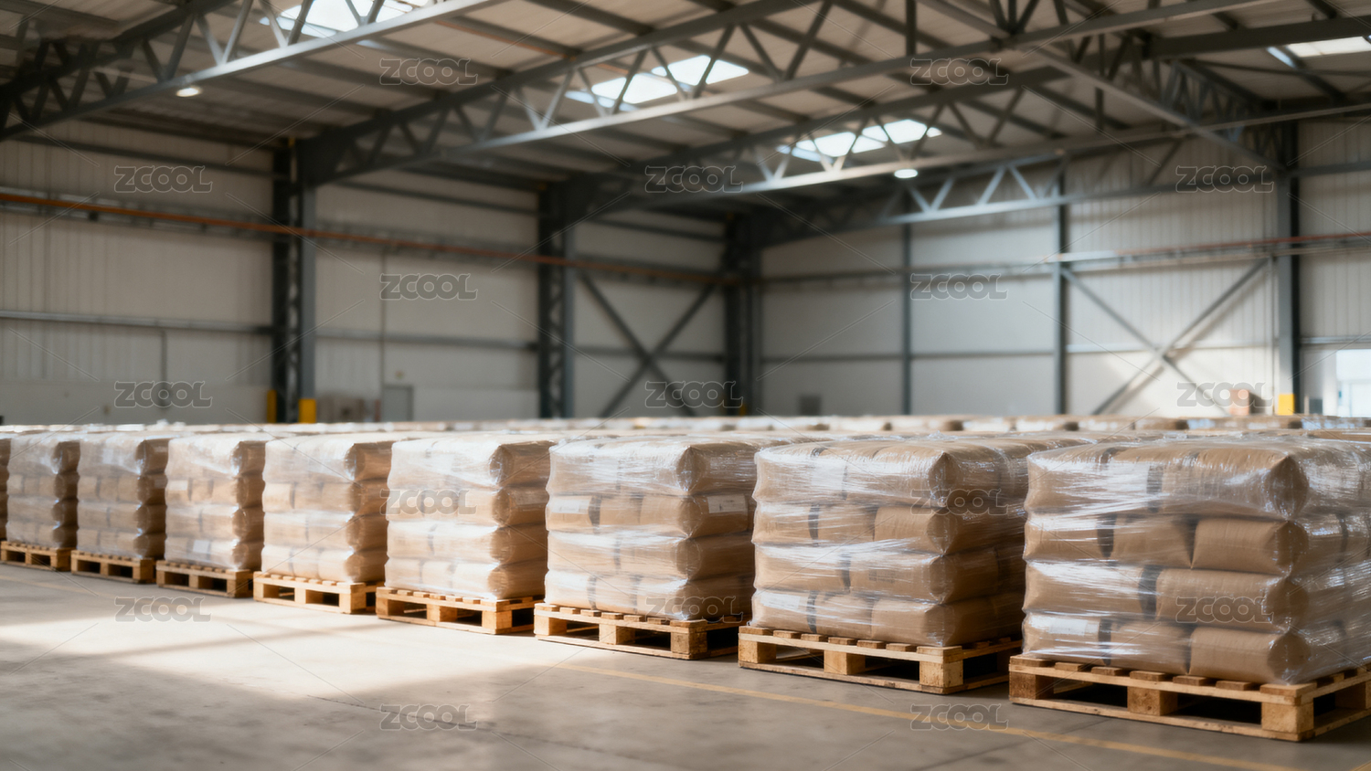 仓库内整齐堆放的货物托盘