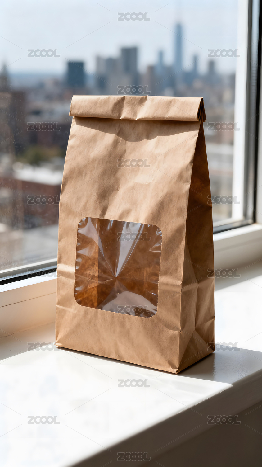 棕色纸袋放窗台前景色模糊