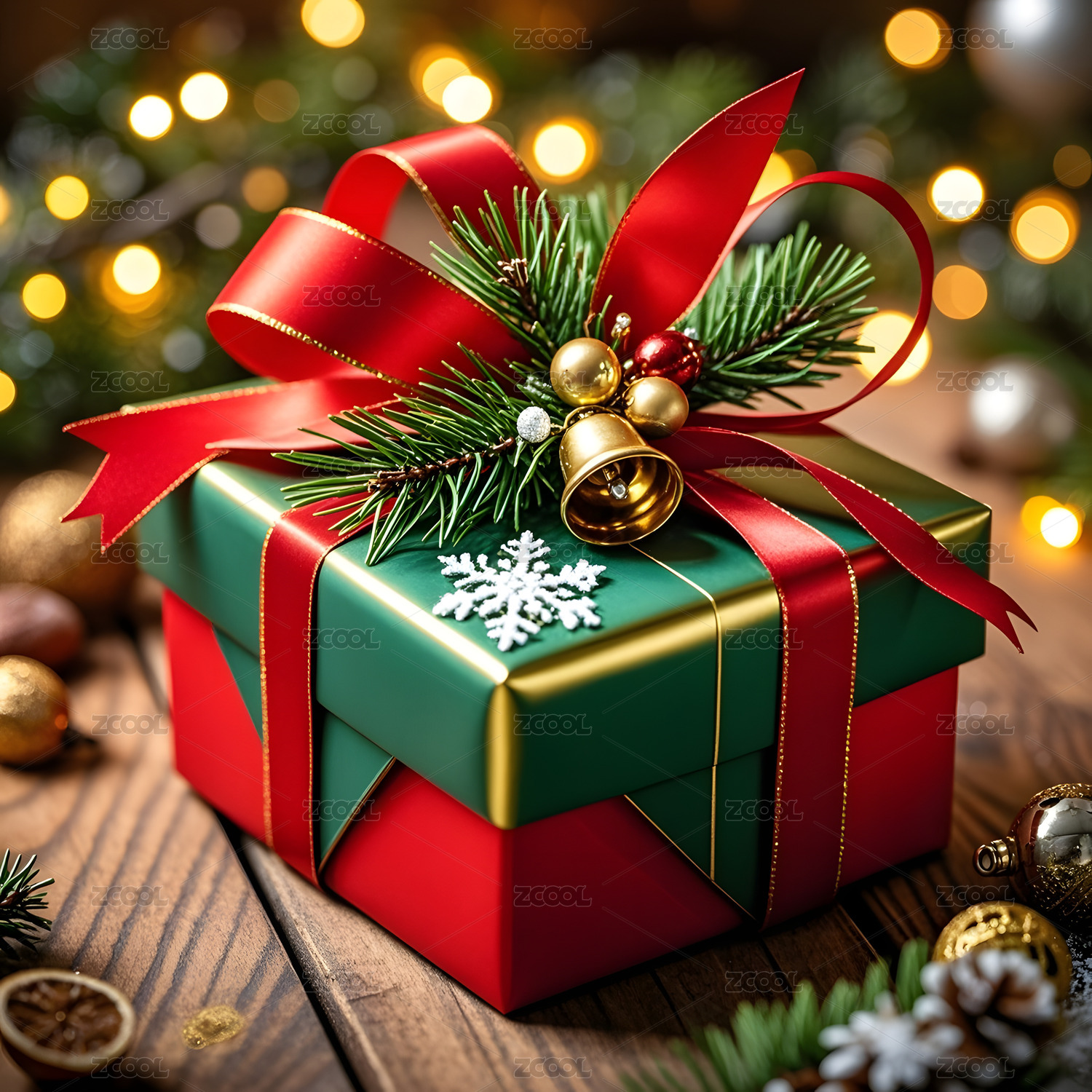圣诞礼盒红丝带松枝金铃特写