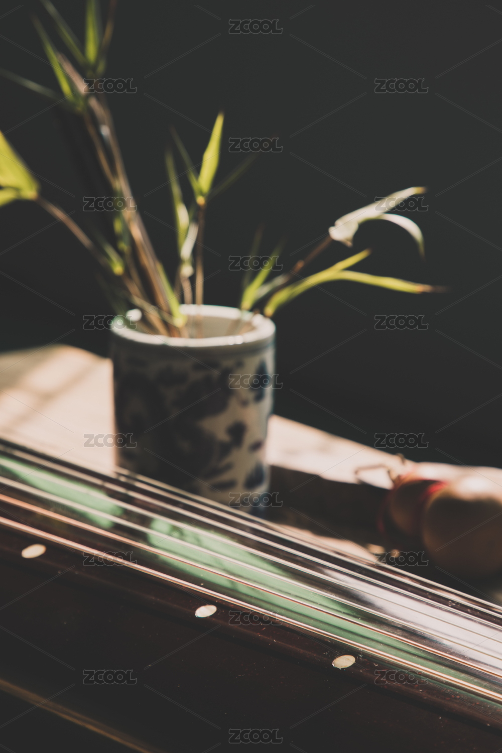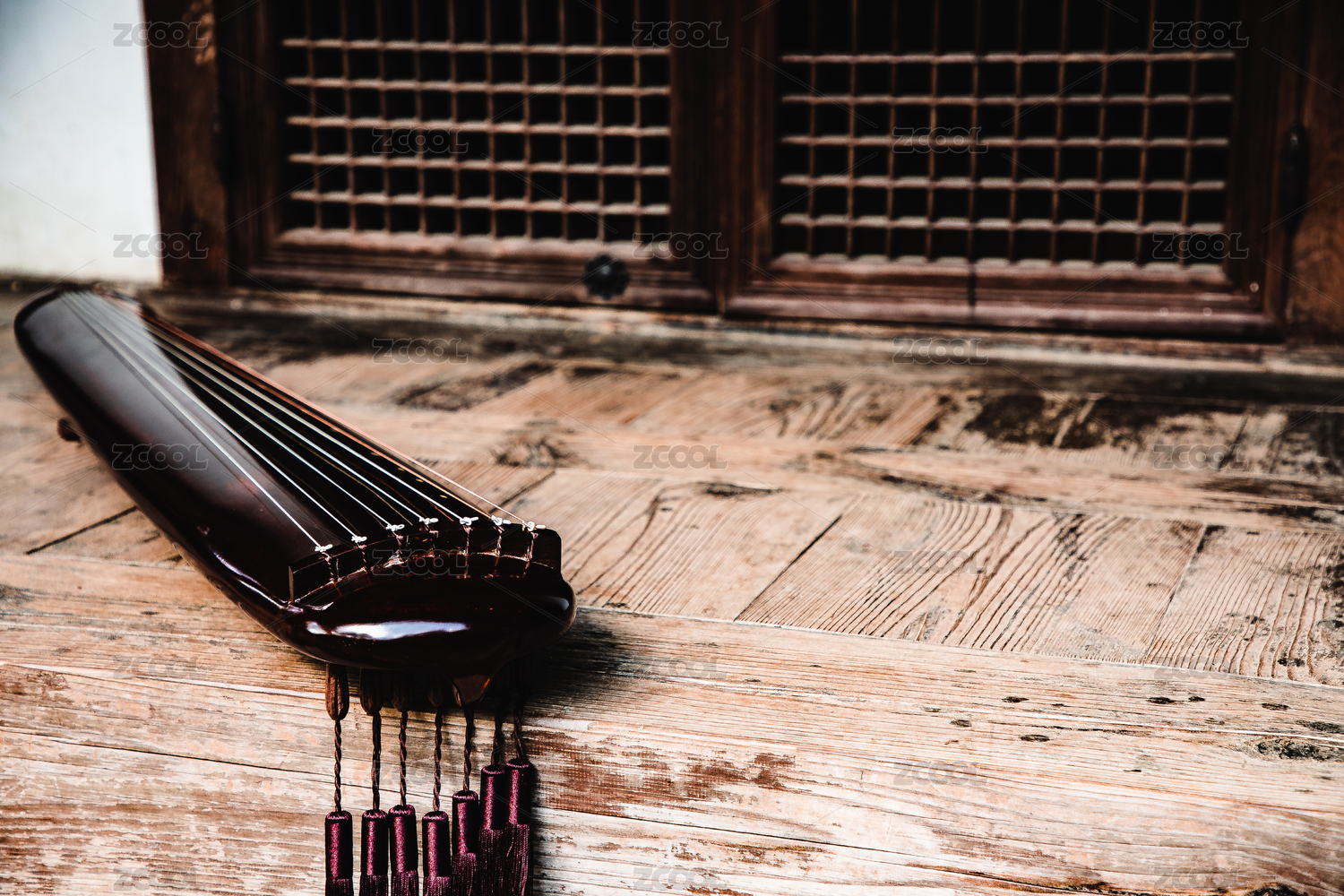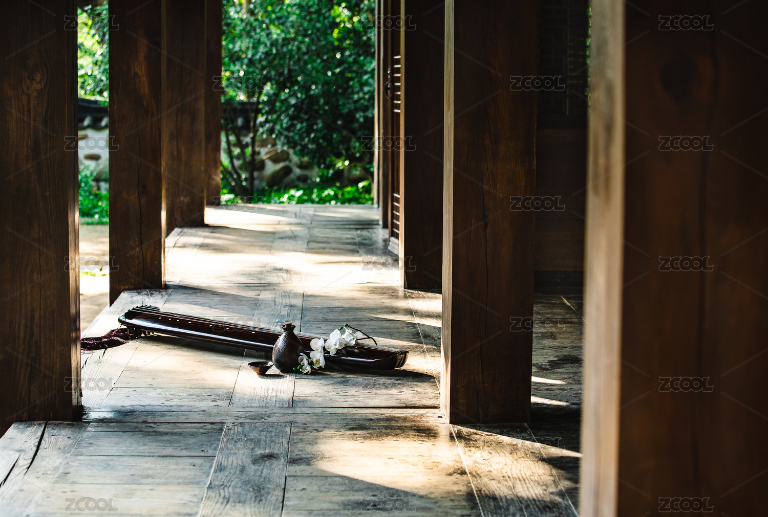 无人的古代中式木质建筑阳台上摆着一台古琴,酒杯酒壶和兰花