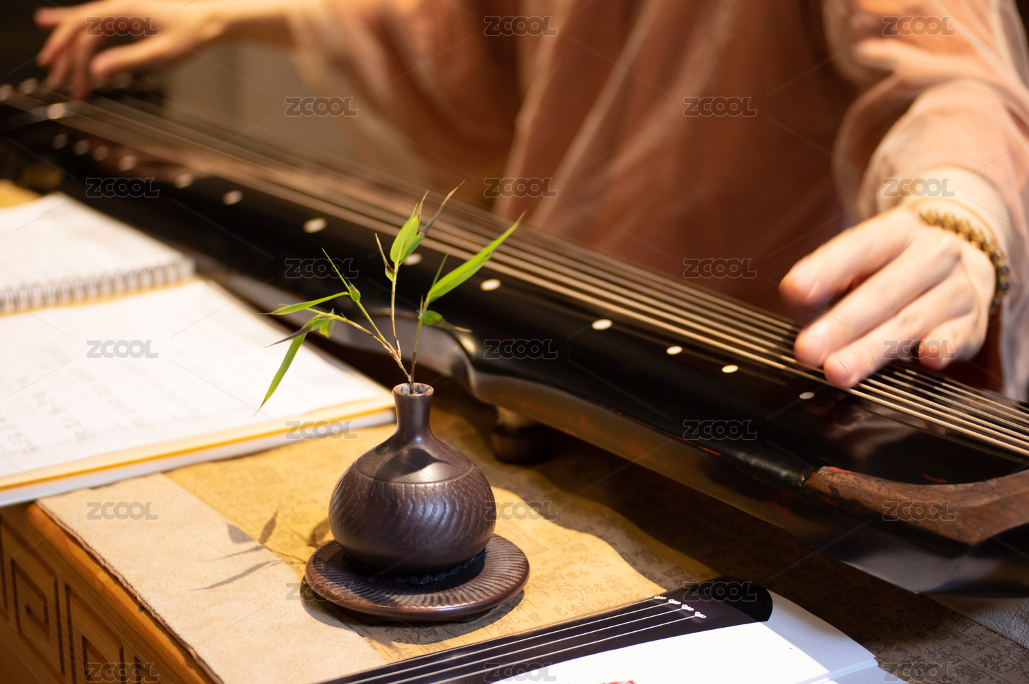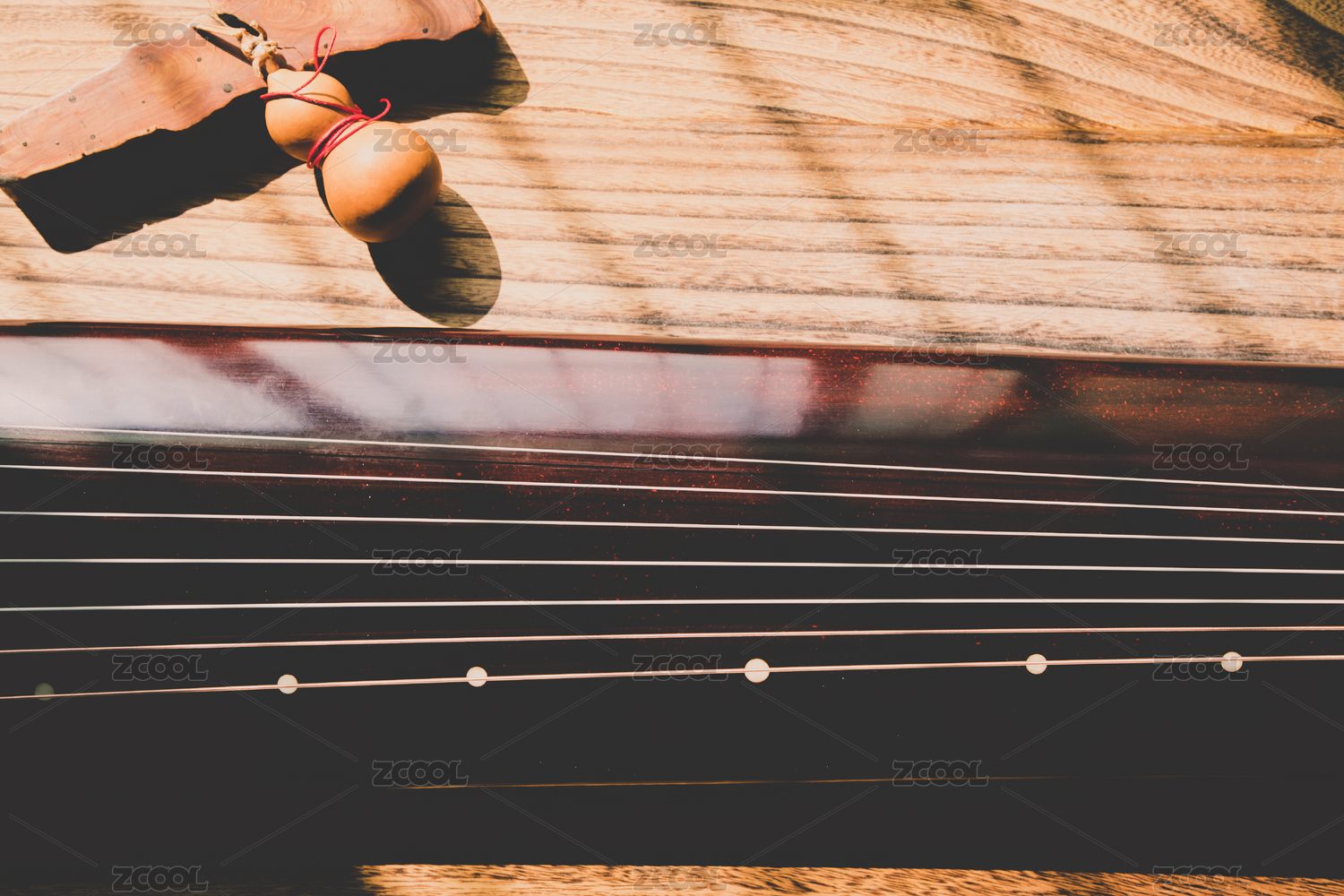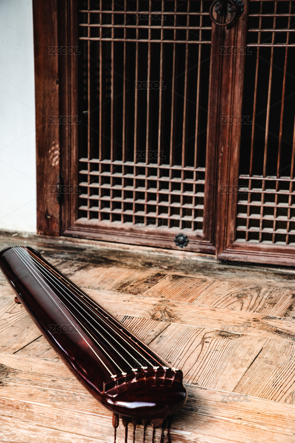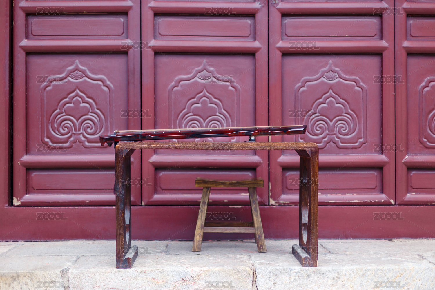 无人的古代中式木质建筑阳台上摆着一台古琴,酒杯酒壶和兰花