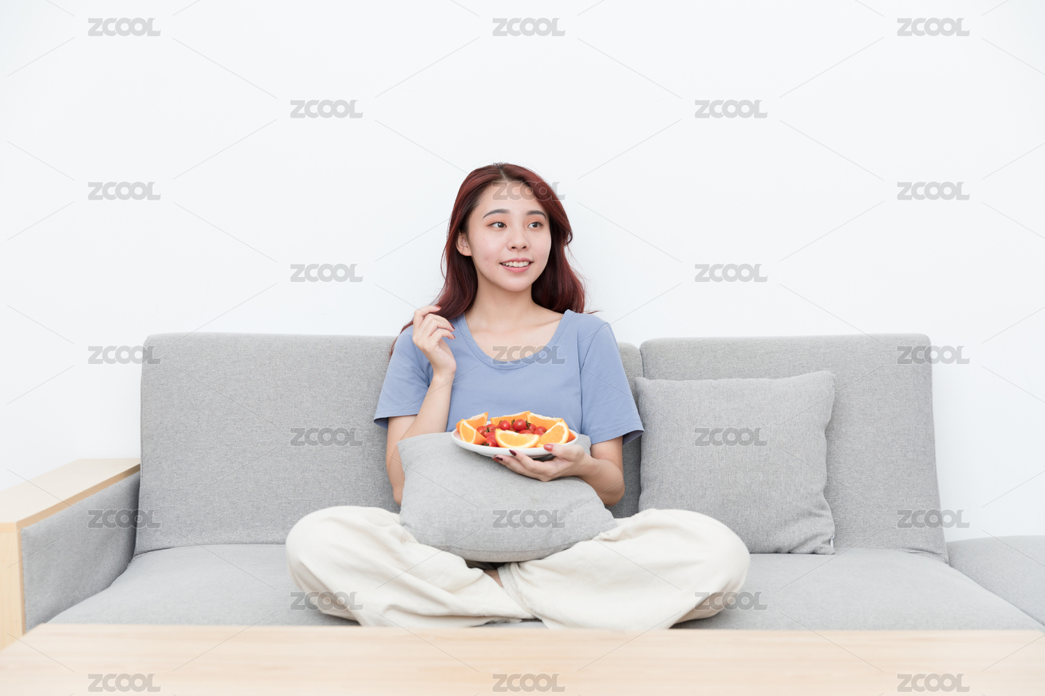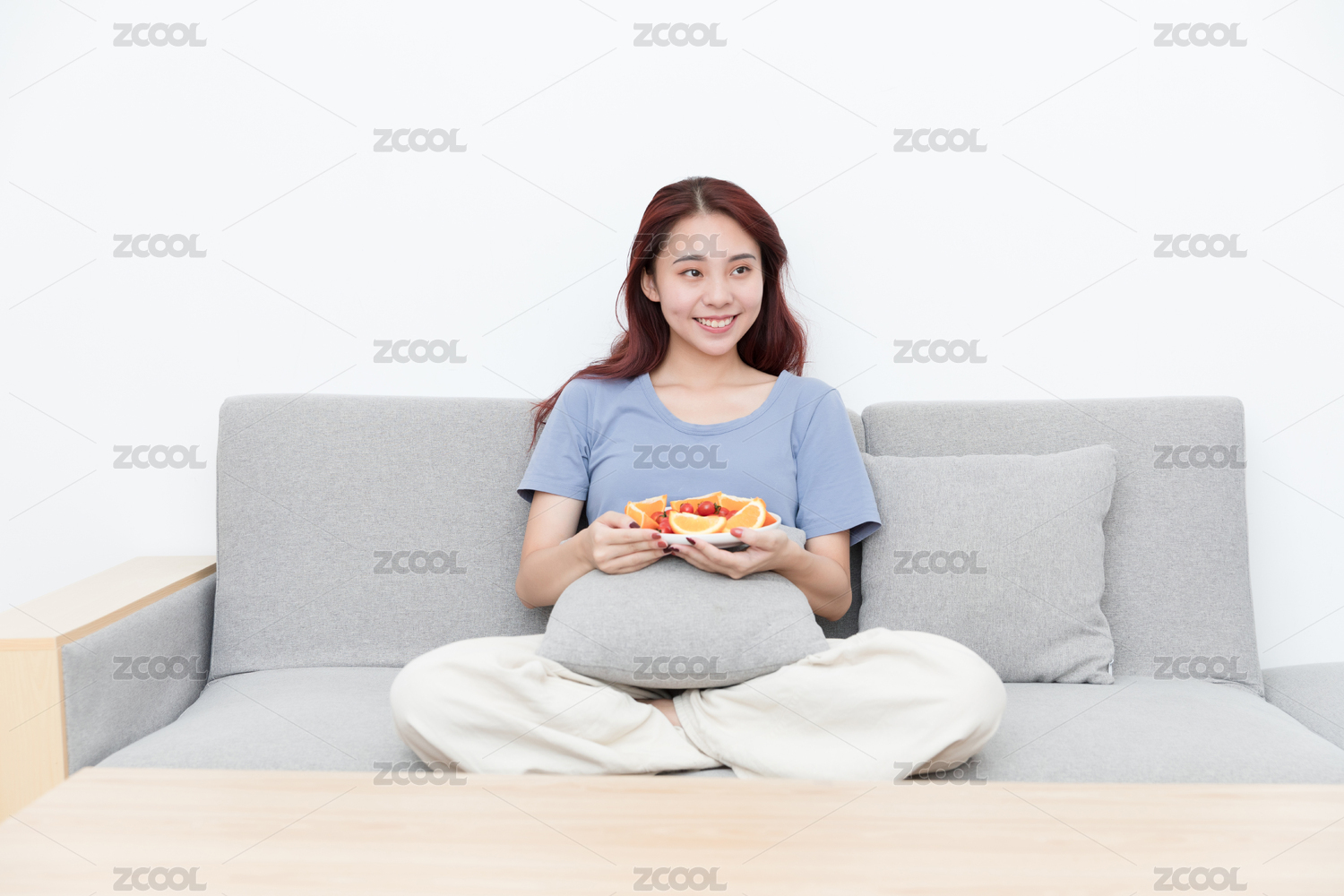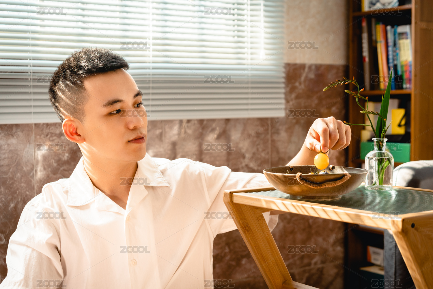 亚洲宝宝坐在儿童餐桌上自主吃水果辅食
