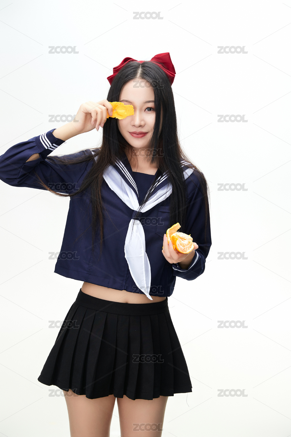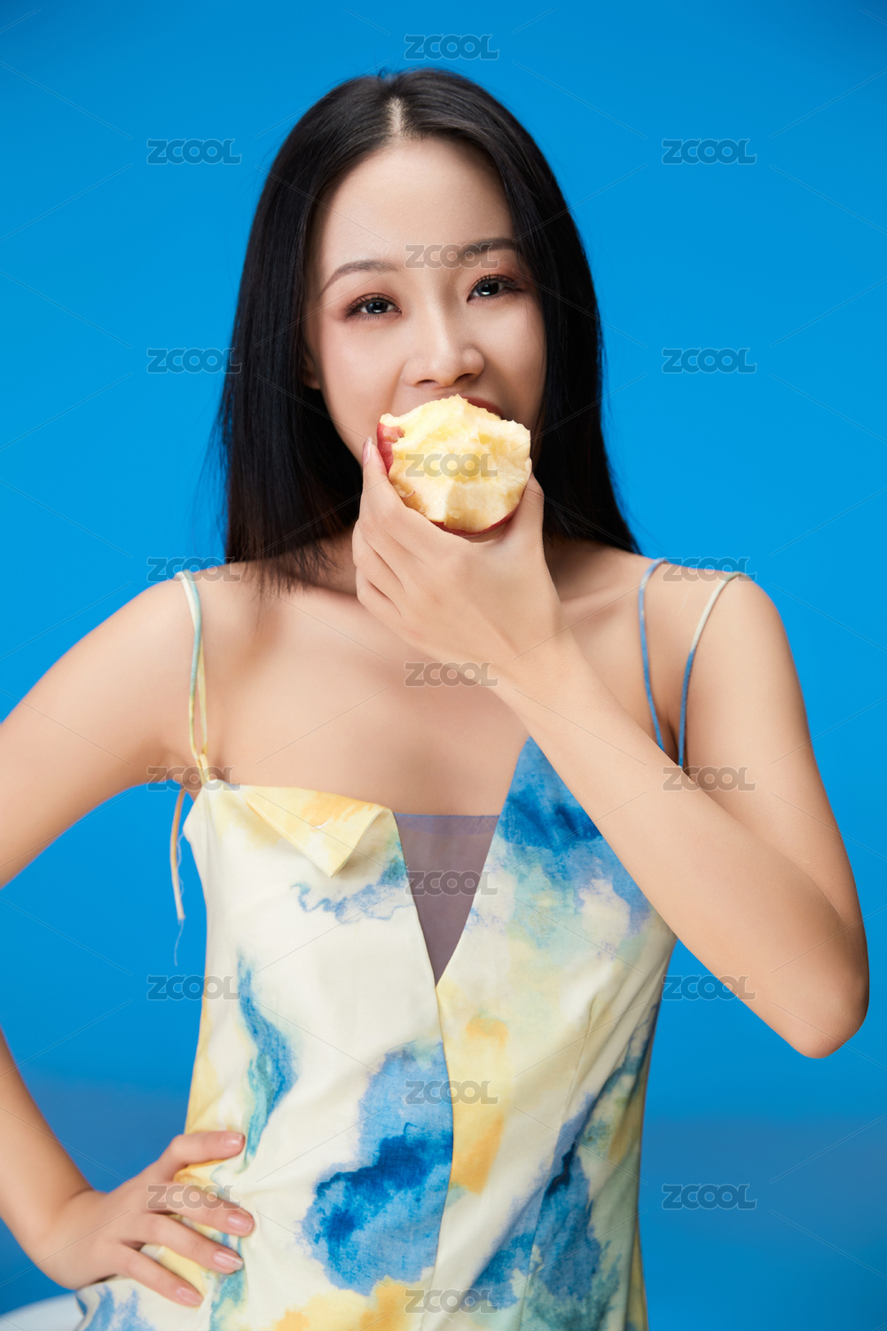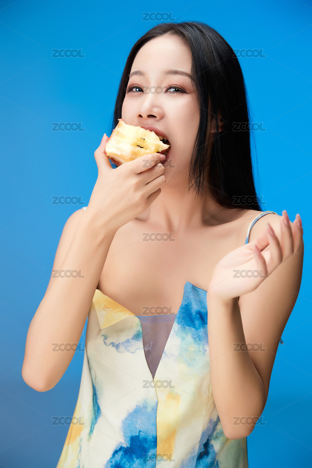 亚洲宝宝坐在儿童餐桌上自主吃水果辅食