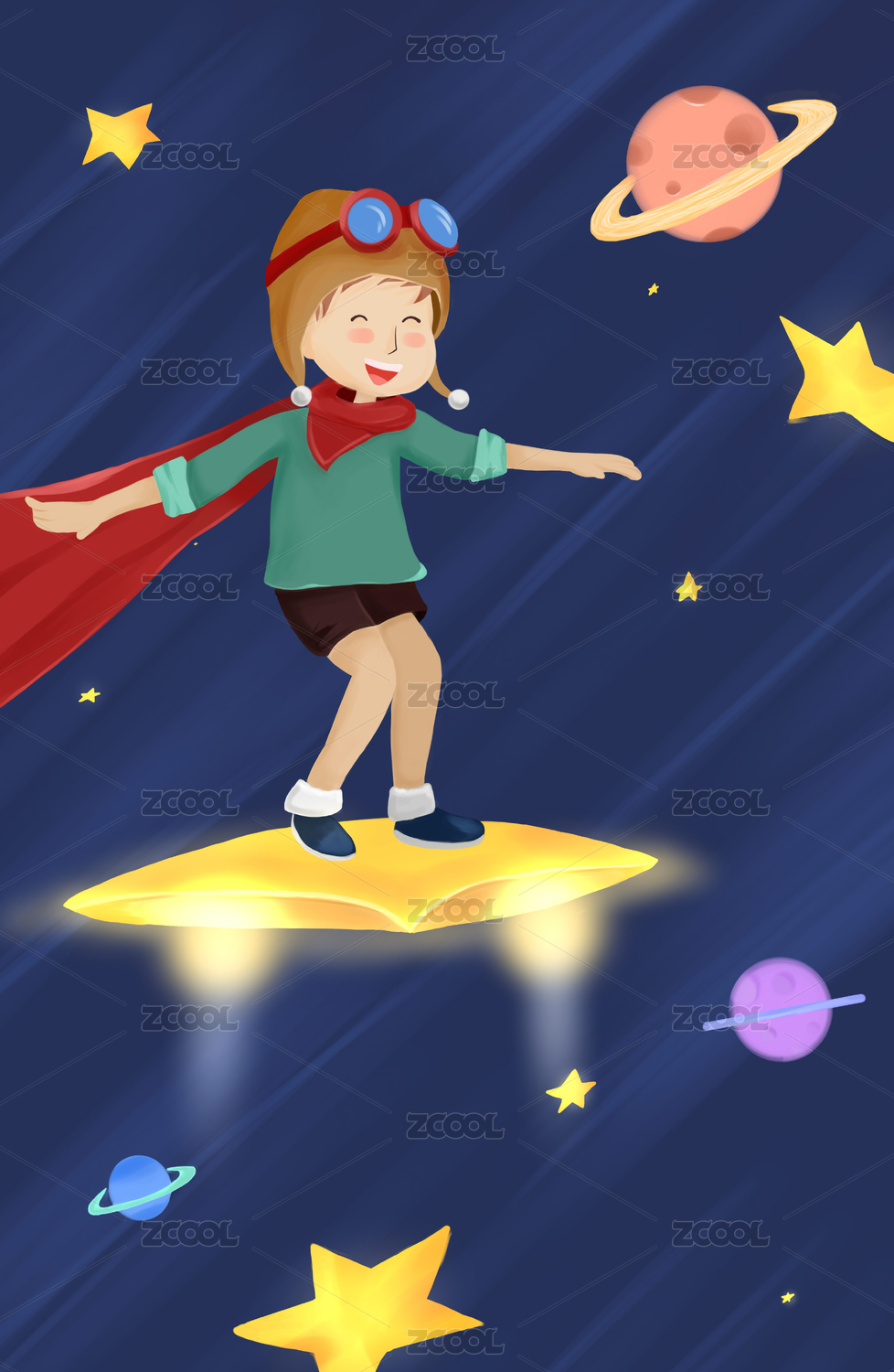 儿童节插画 在宇宙中戴着飞行员帽子披着红色披风的小男孩踩在星星上飞行 创意想象力卡通手绘插图 竖版