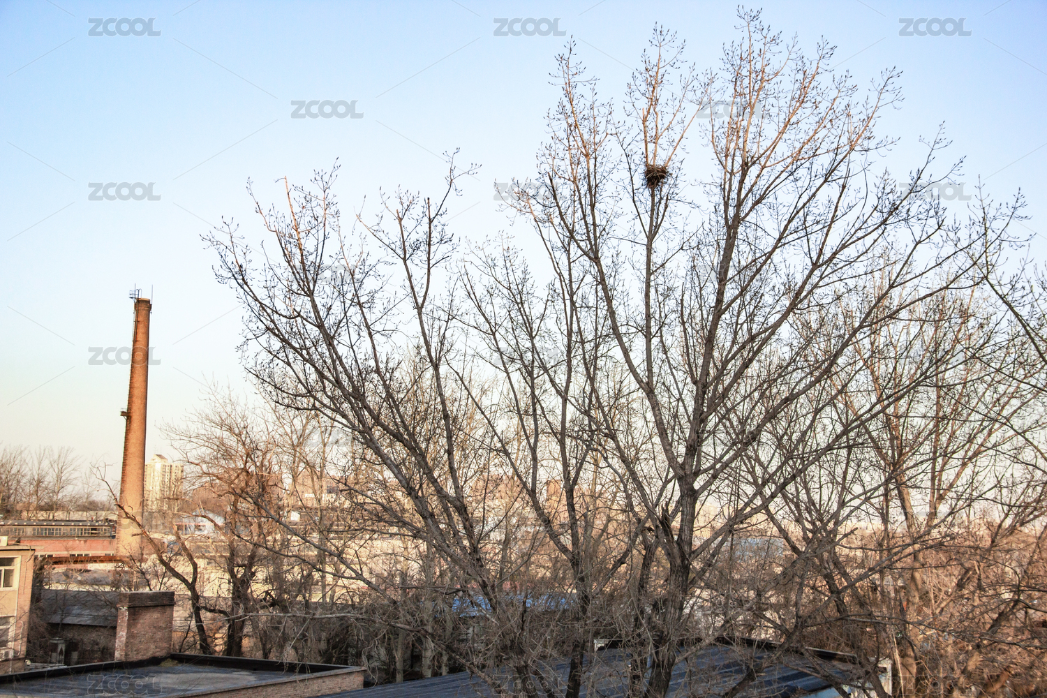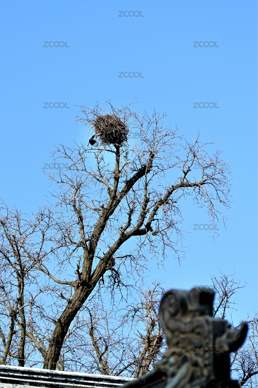 蓝天背景下 光秃树枝上的鸟巢和上空的白云
