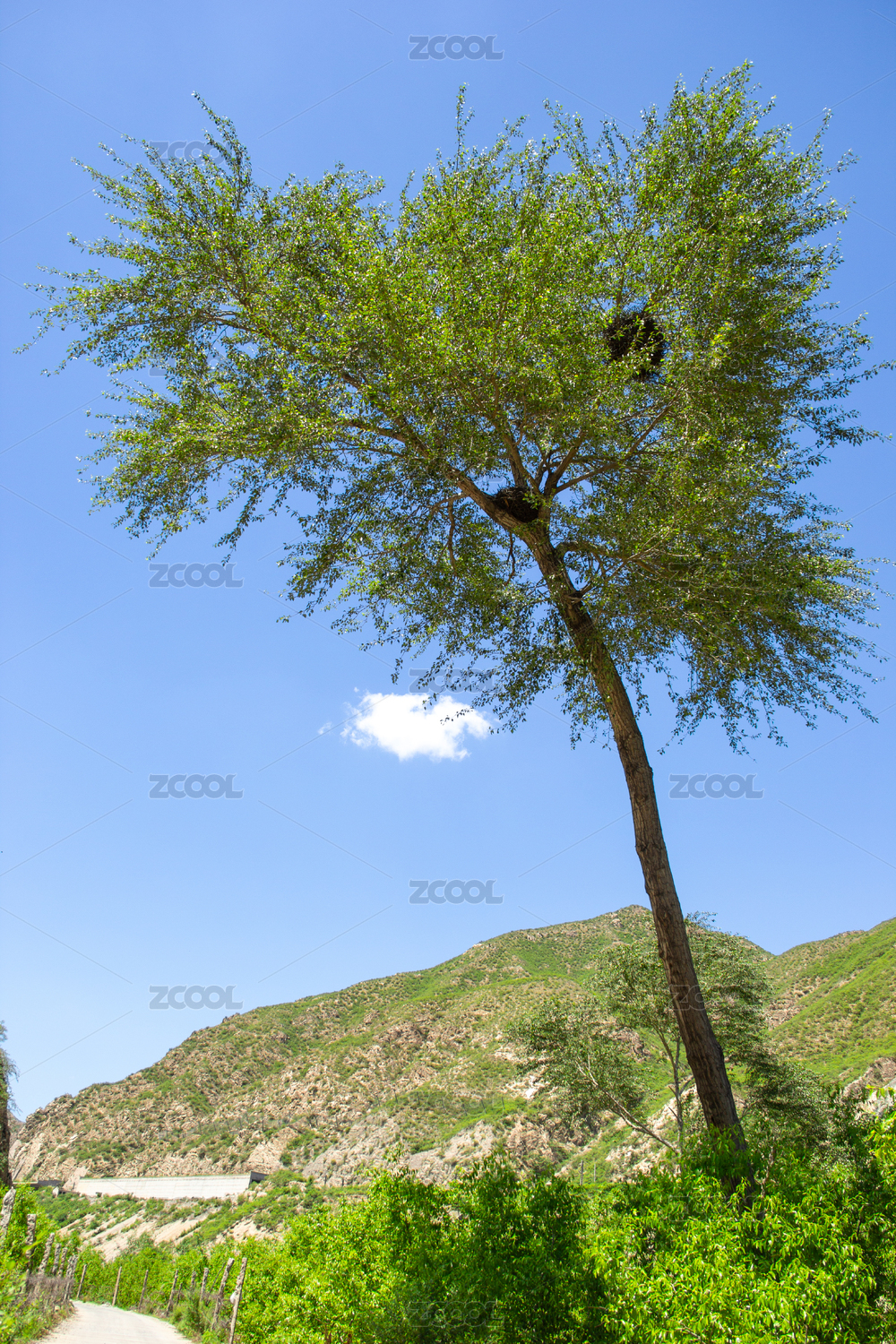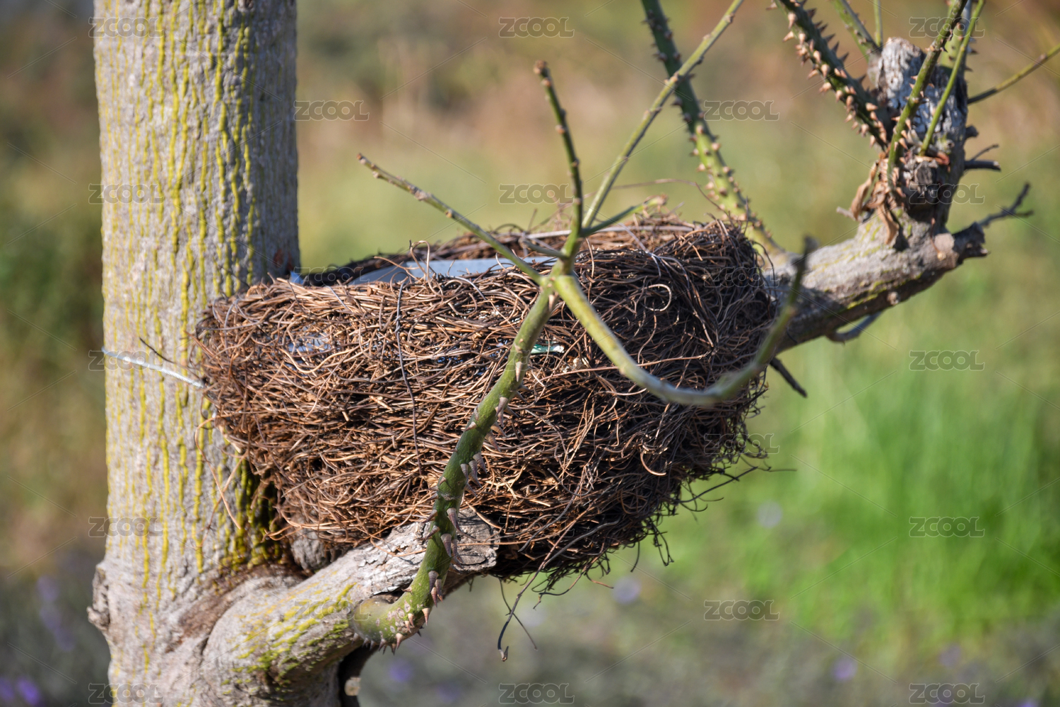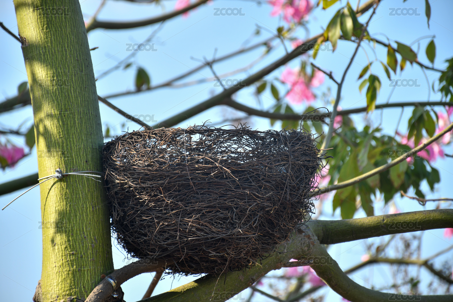 阳光下树上悬挂的鸟巢与繁茂枝叶景观