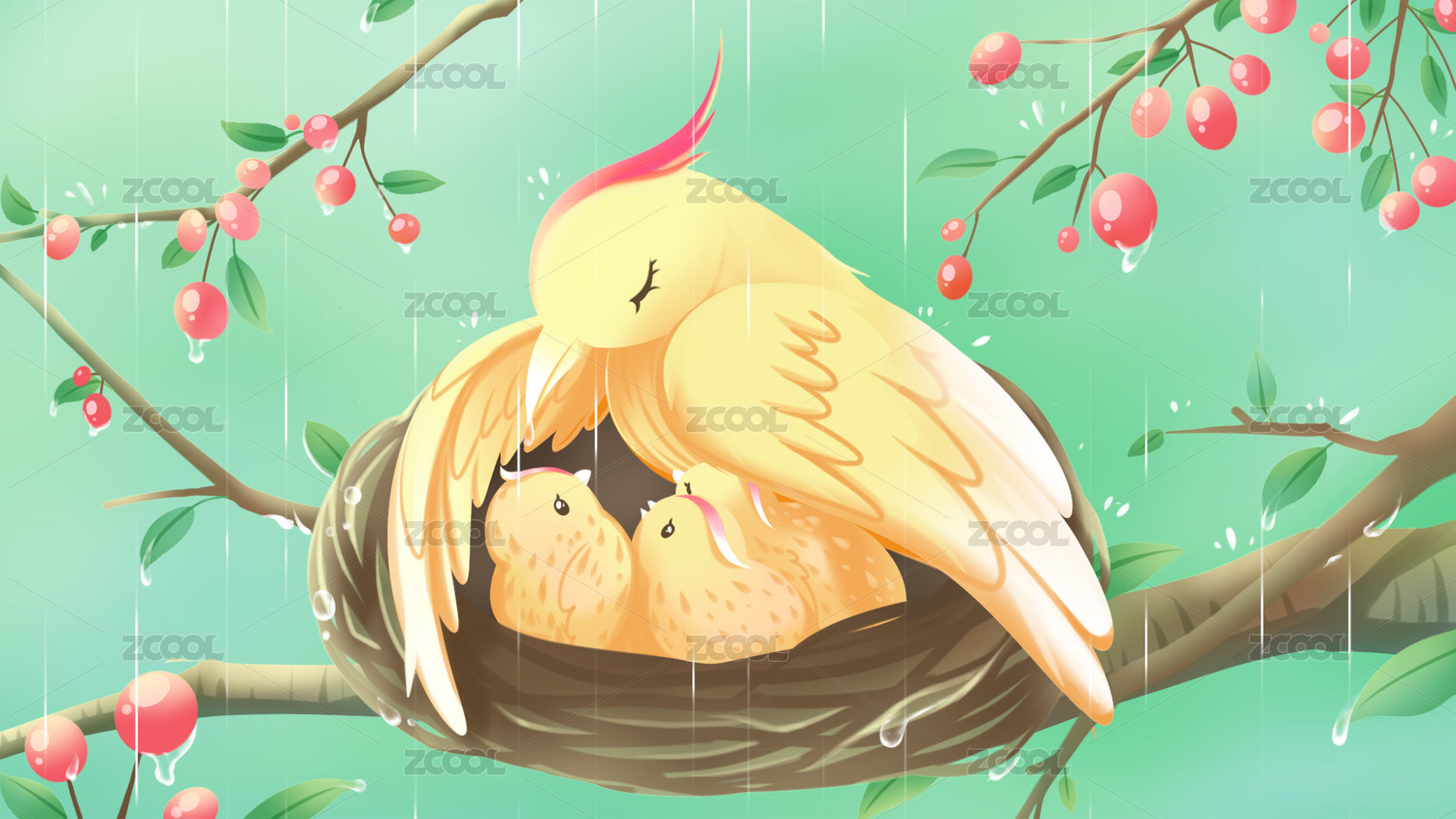 鸟妈妈给窝里的小鸟挡雨,鸟巢周围果子熟了