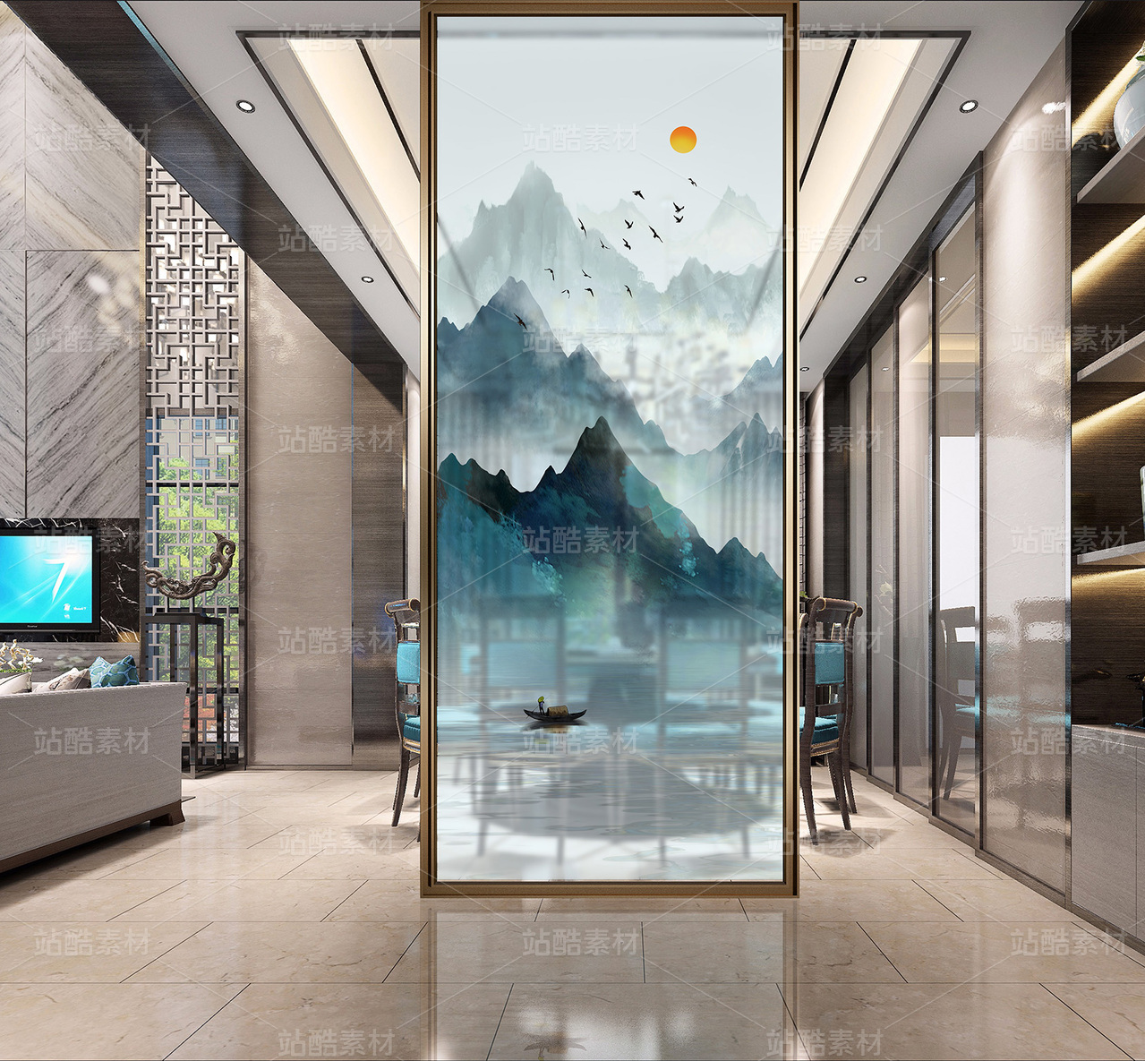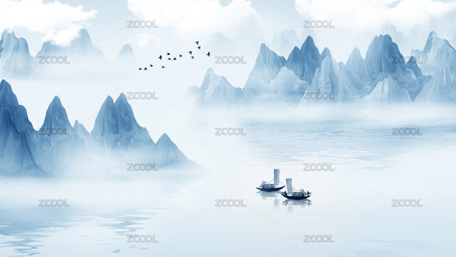 宽屏手绘中国风蓝色意境水墨山水风景画