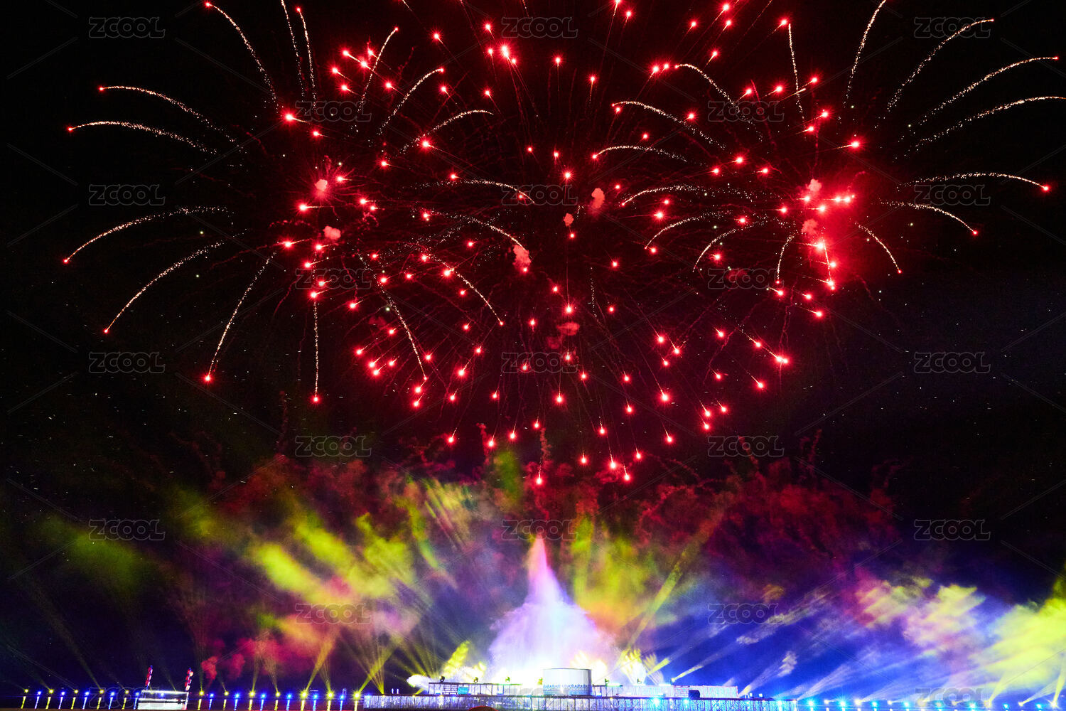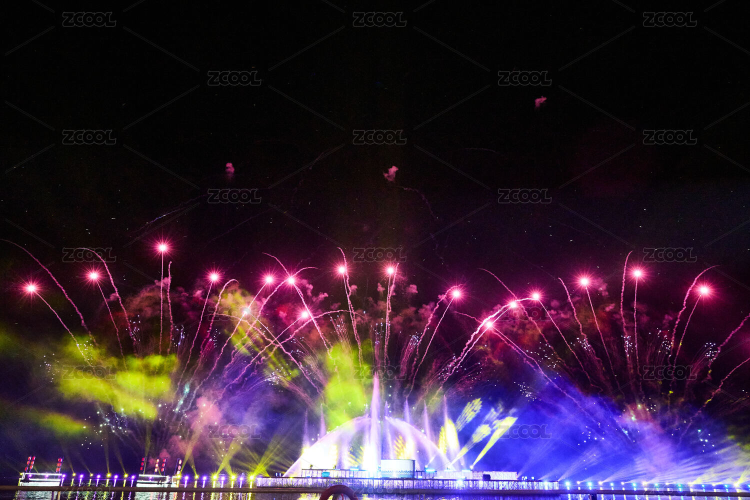旅游景区湖面绽放的绚丽烟花礼花