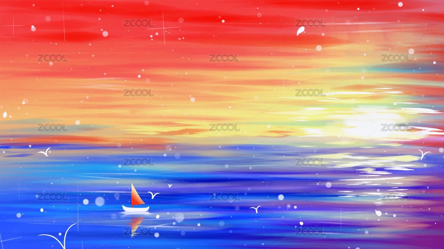 橙红色的夕阳下,蓝色的海面上飘着一艘小船,唯美的油画质感的炫彩治愈插画