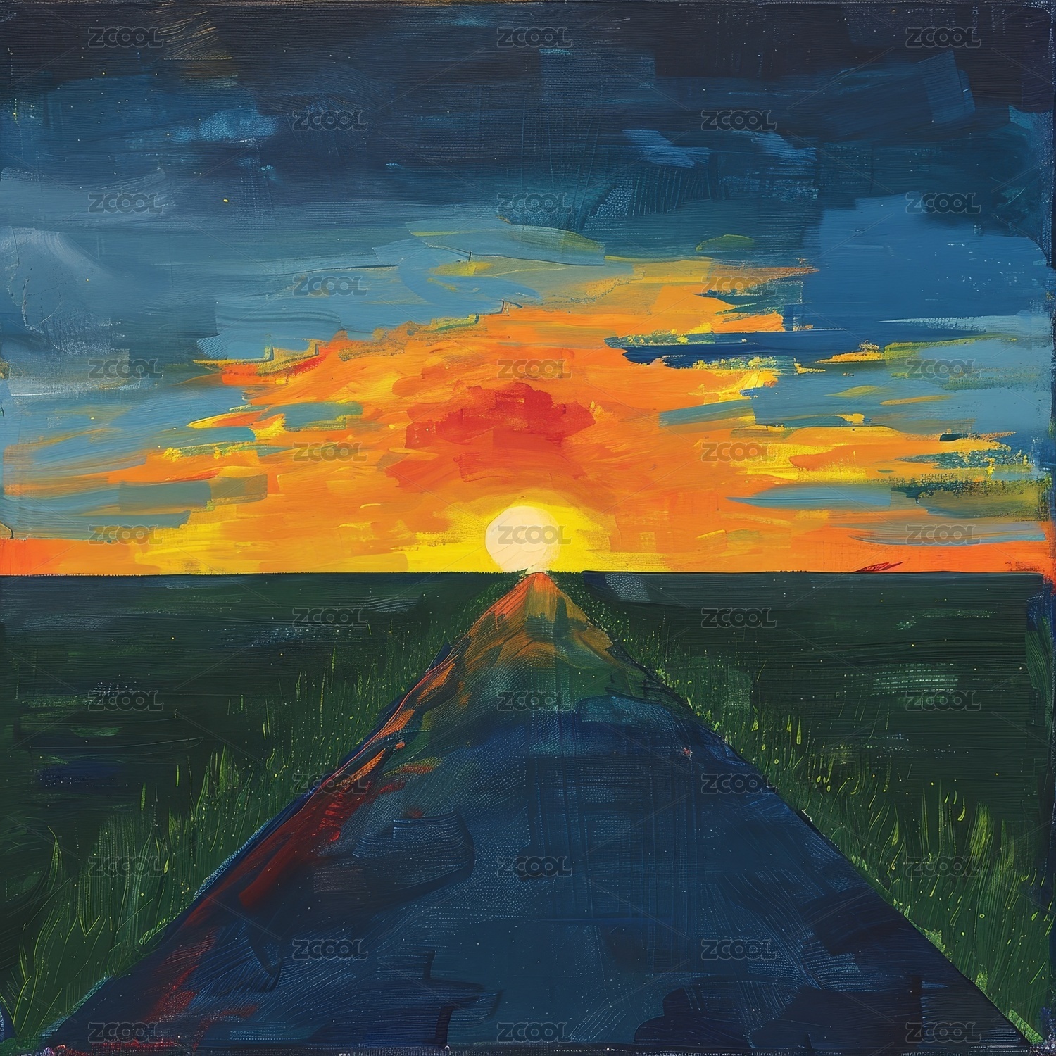 夕阳公路远景油画风景图