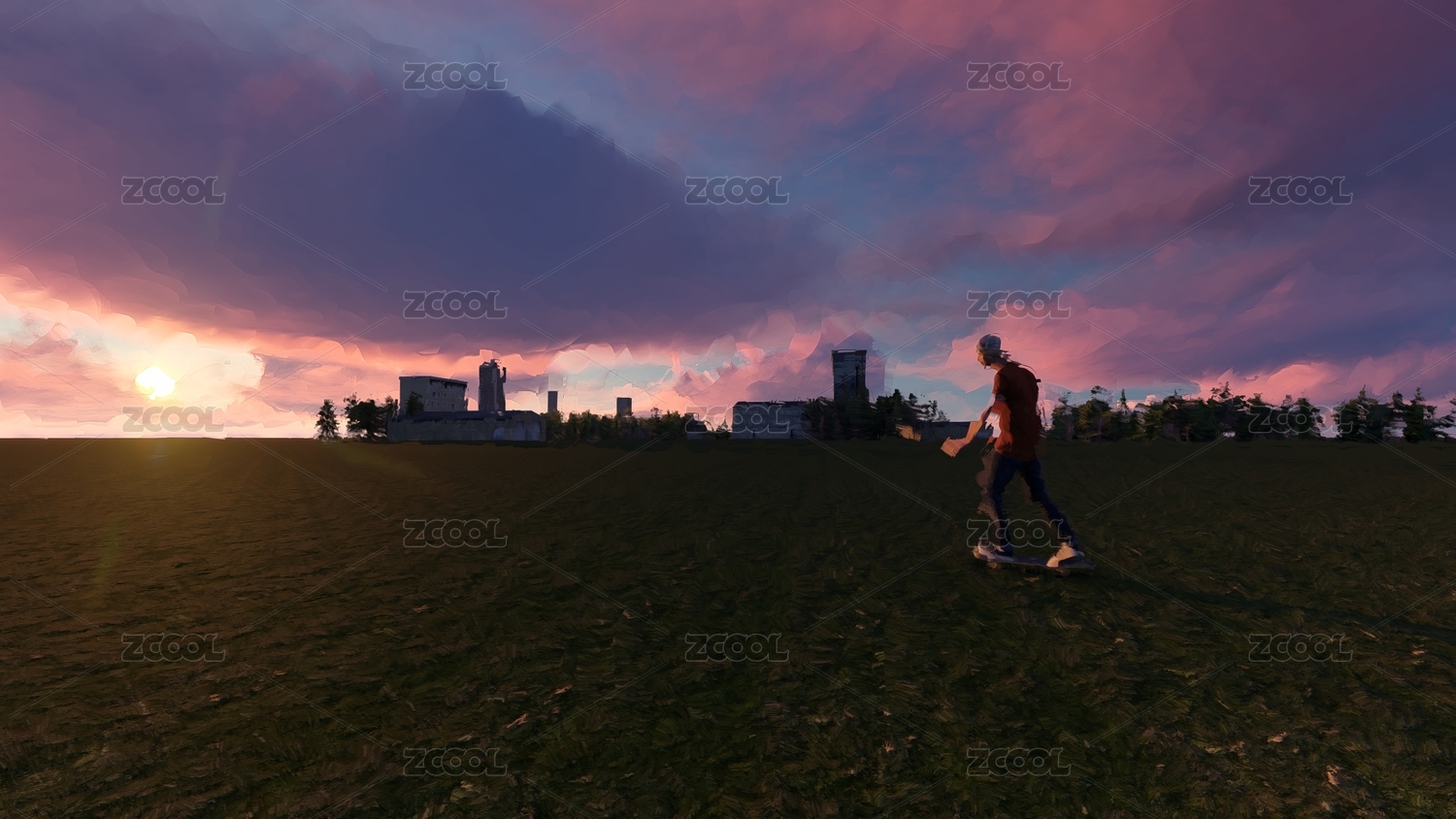 夕阳下滑板车男孩和城市涂抹风格