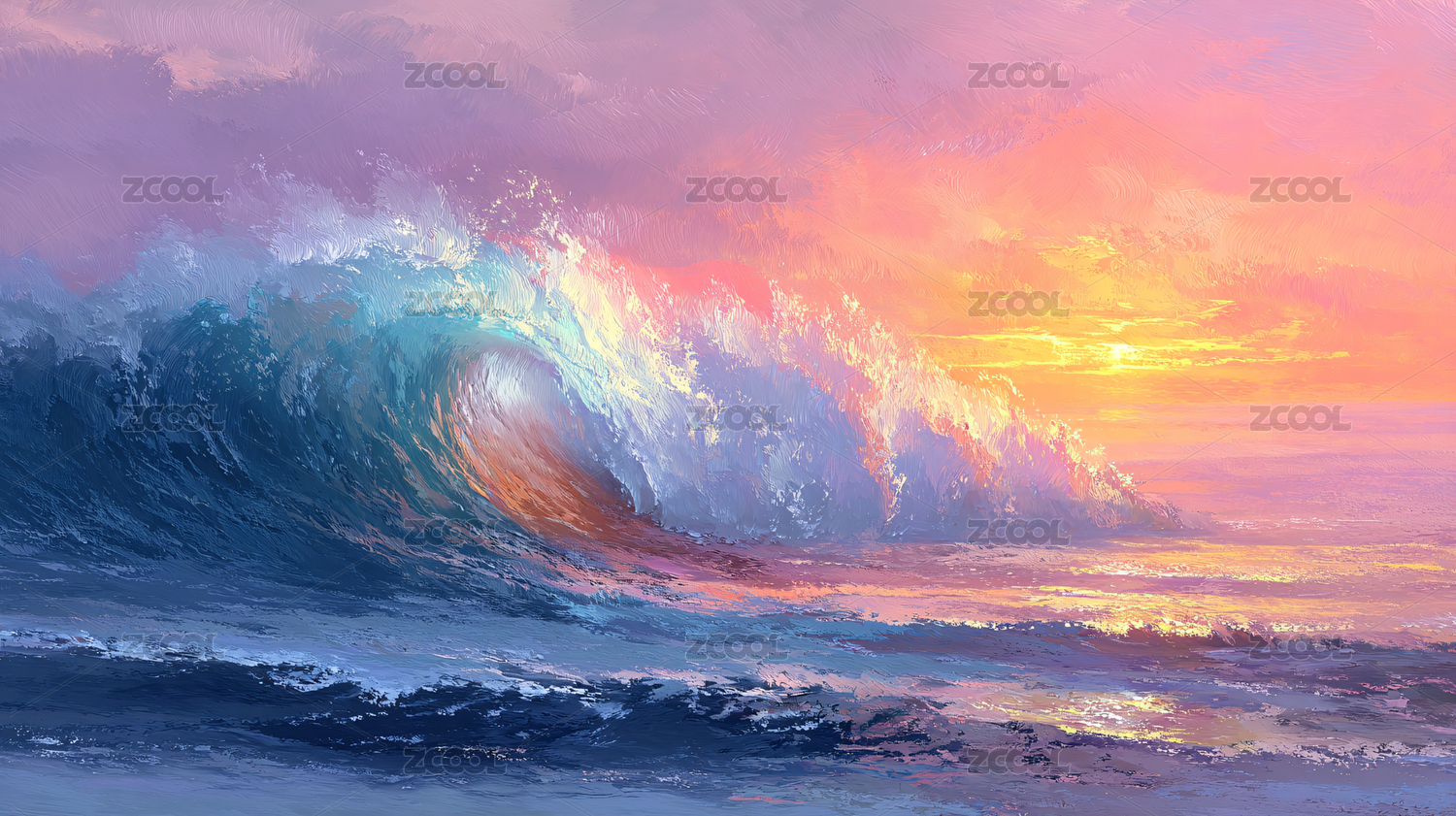 绚丽的落日晚霞海浪艺术油画