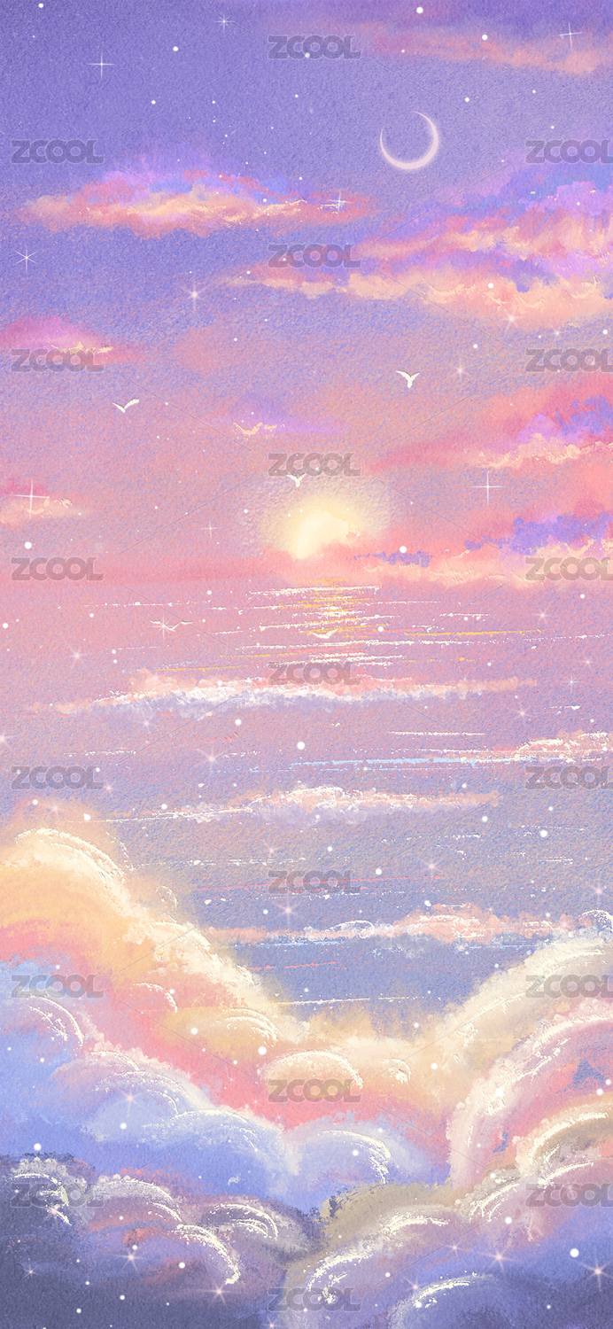 抽象五彩油画笔触天空海边沙滩日落
