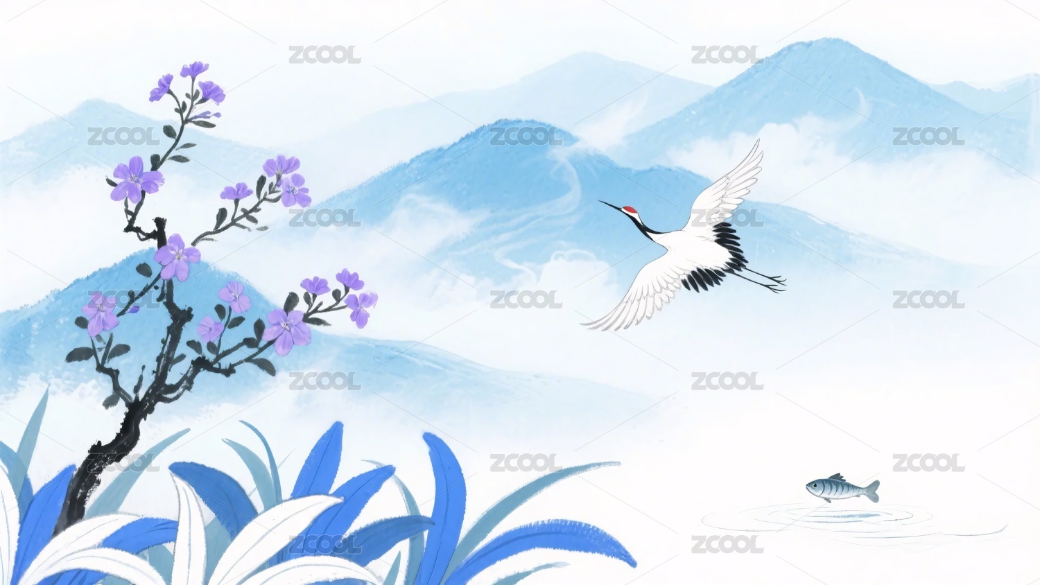 中式山水花鸟意境插画