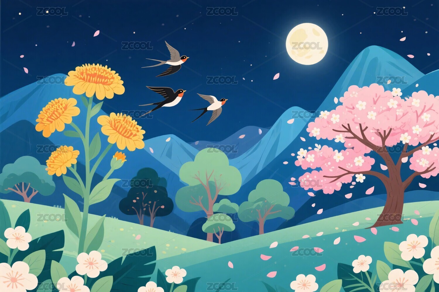 夜间山水花鸟插画