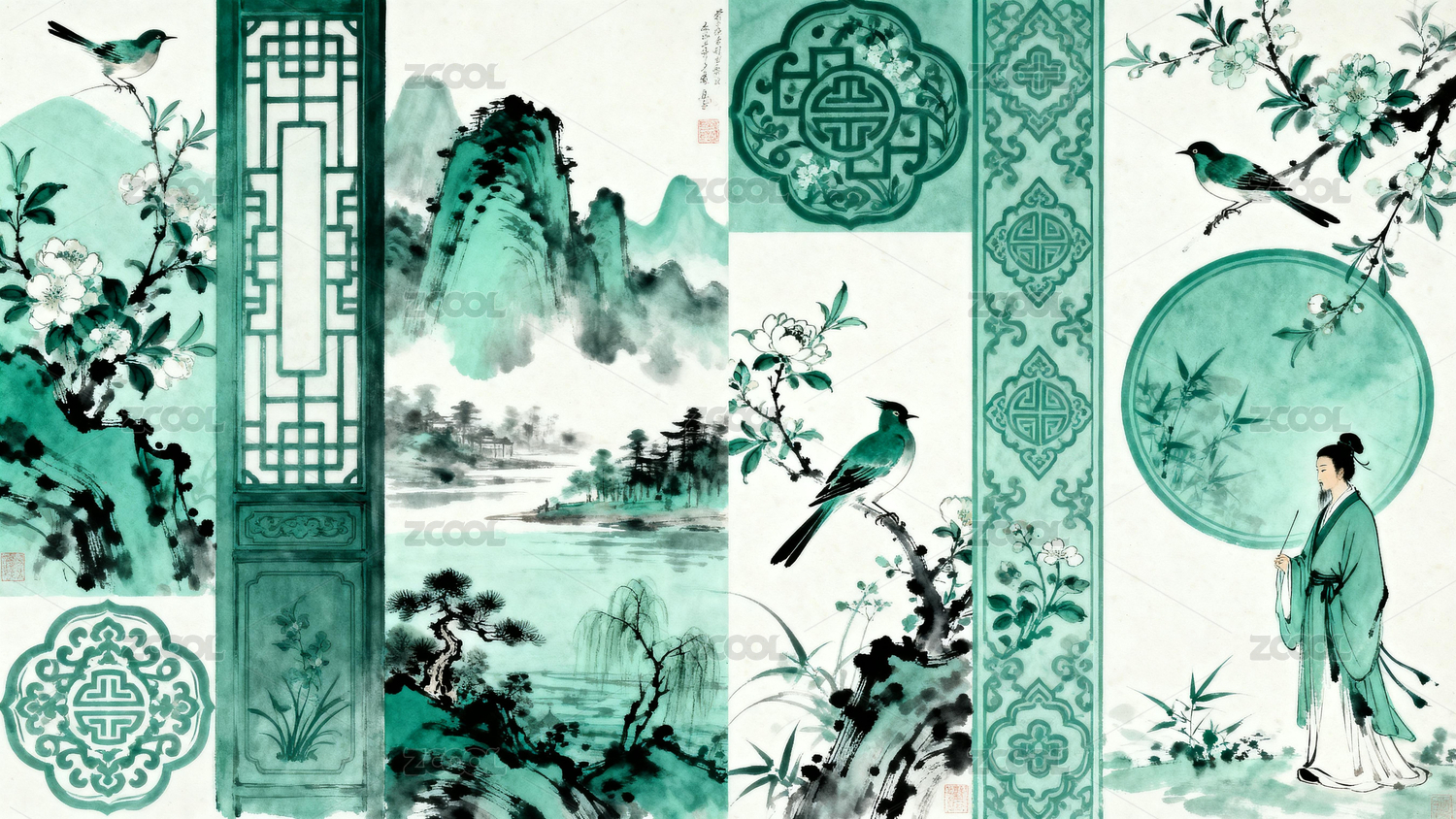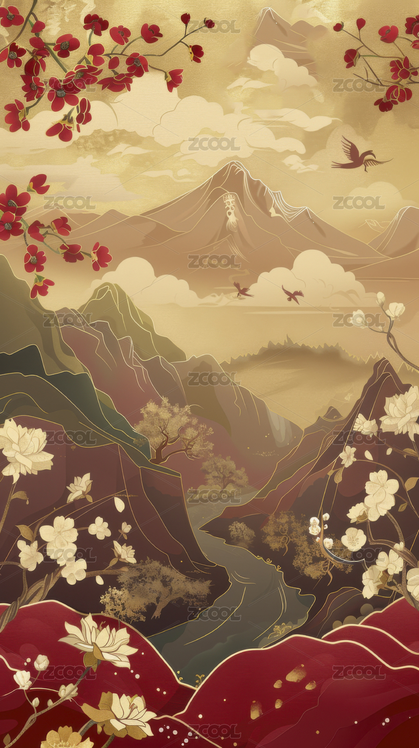 花鸟山水中式插画画面