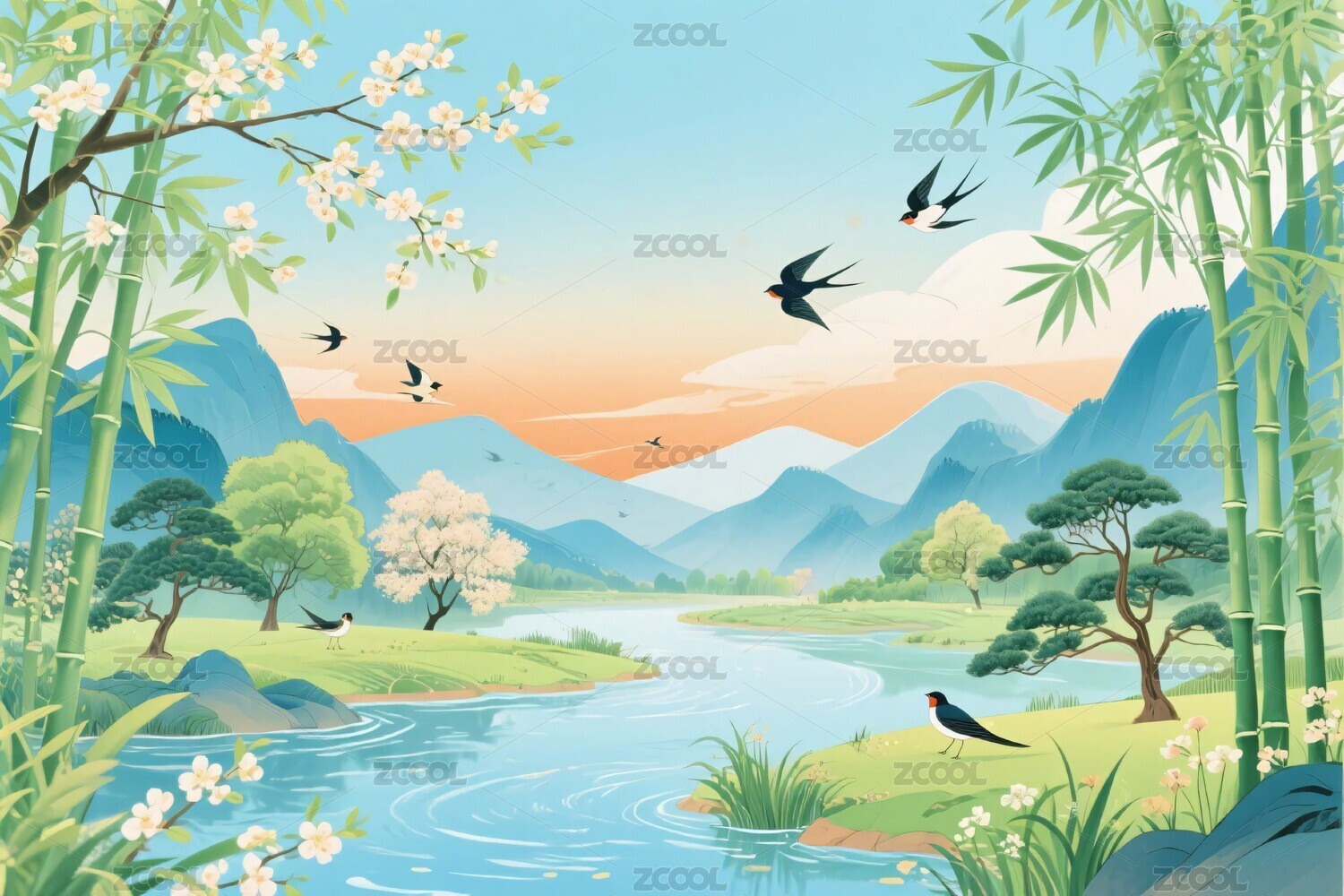 春日山水花鸟插画风景