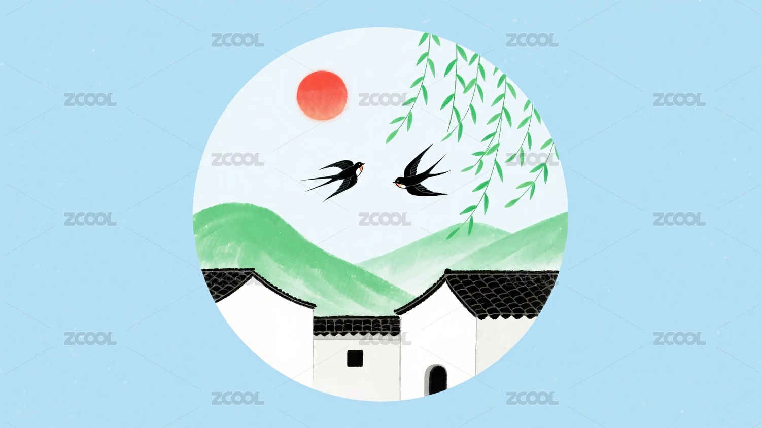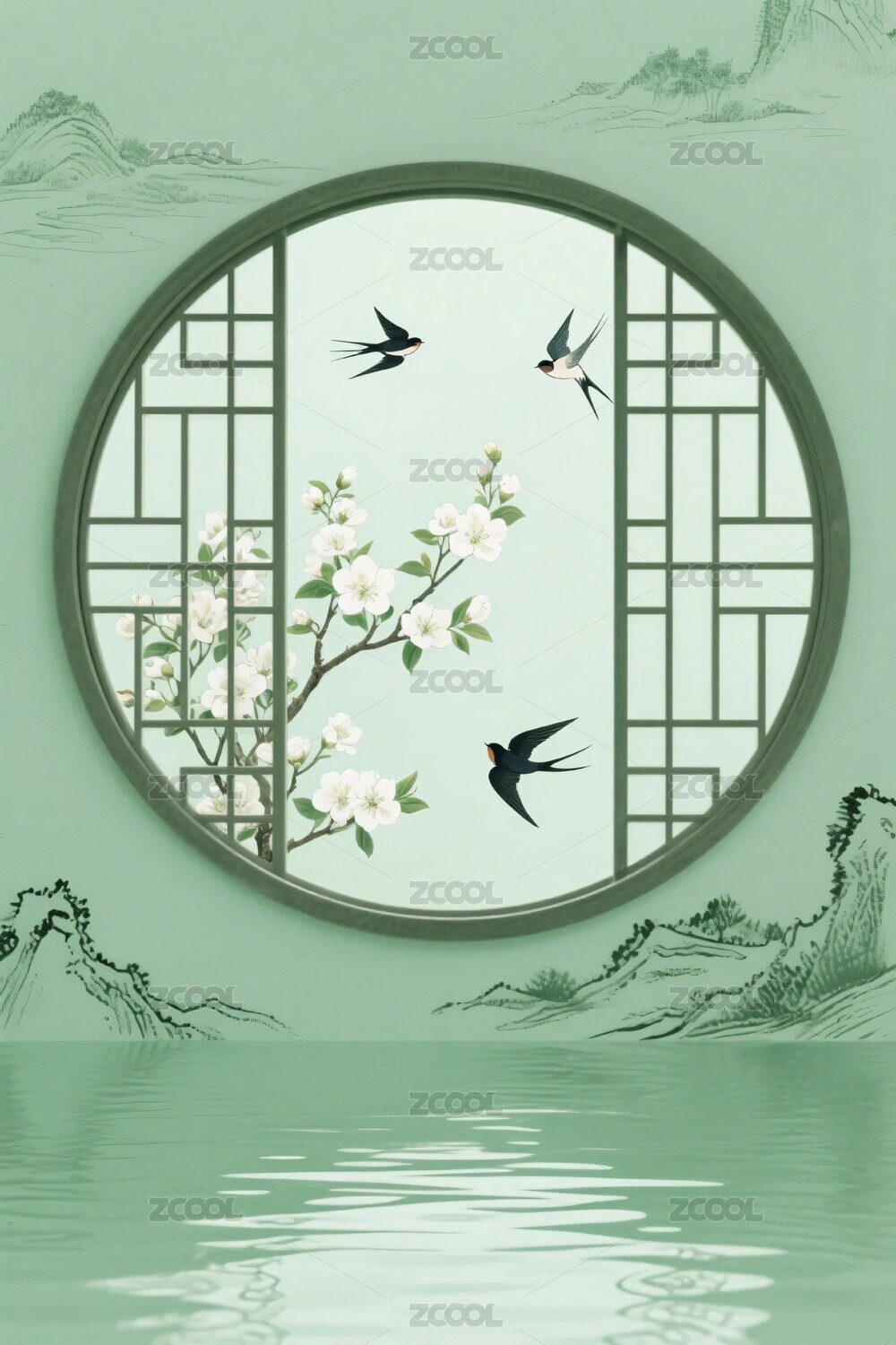 古典花鸟山水圆窗插画