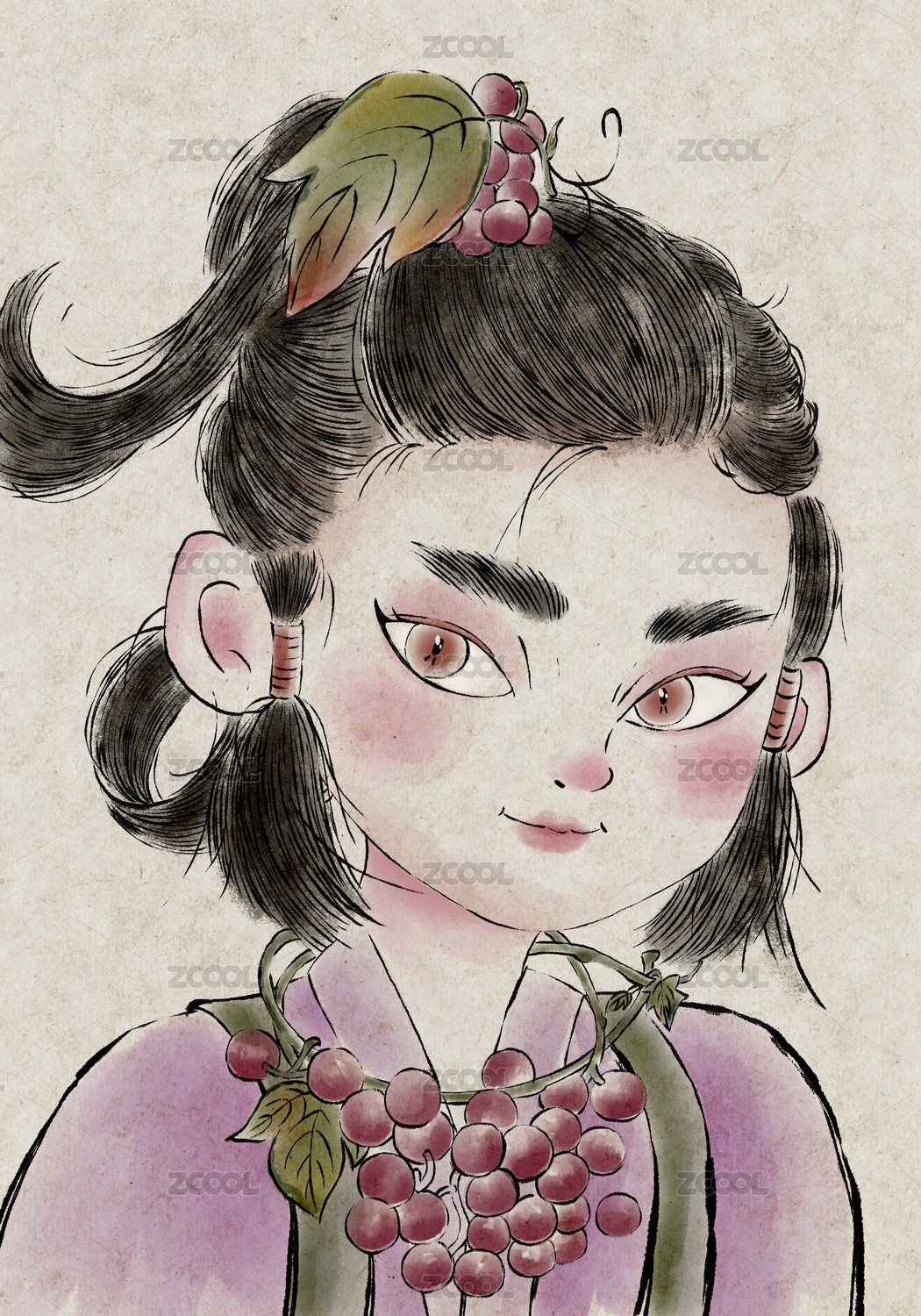 传统水墨中国画人物,拿扇子拥抱的两个女童