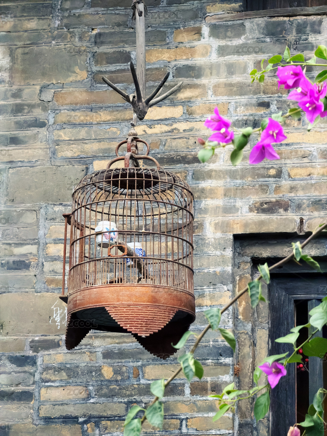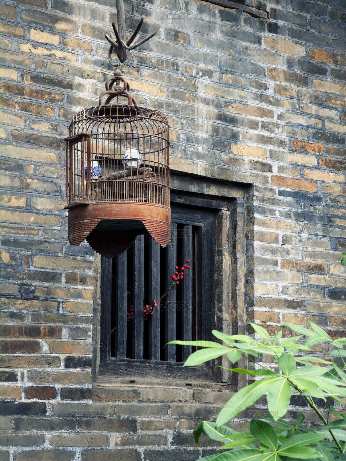 中国南方古村落建筑外悬挂的一个老式鸟笼