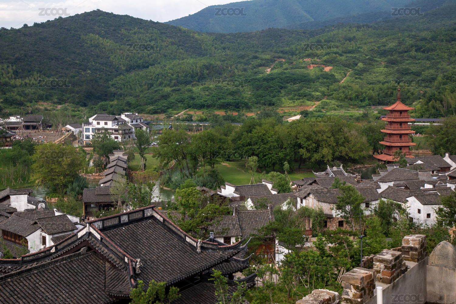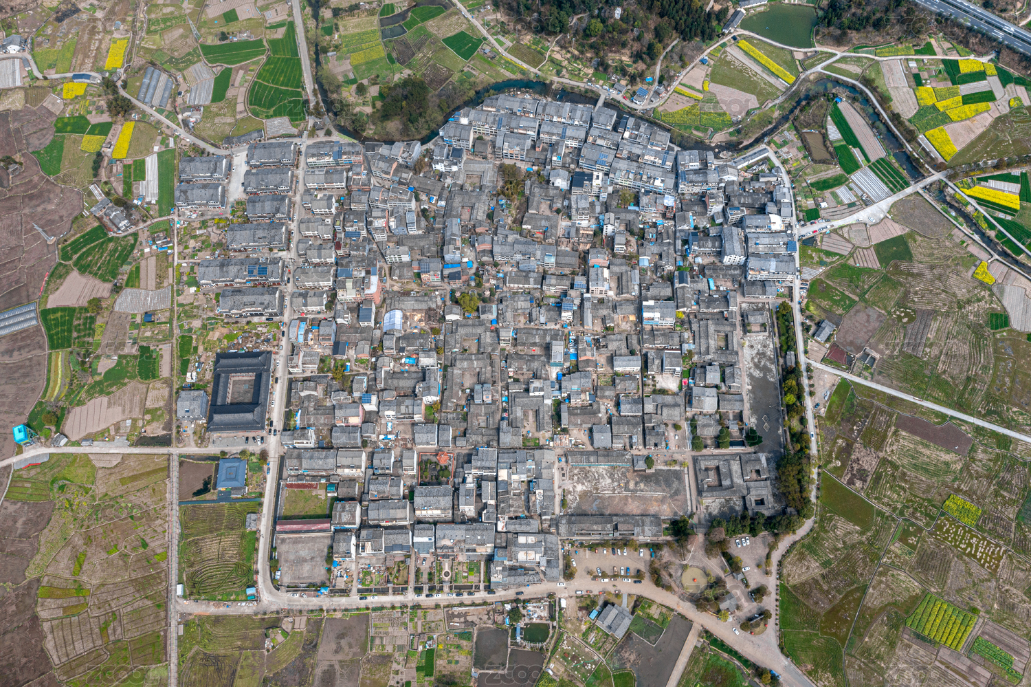 古村山水环绕,塔楼点缀其间