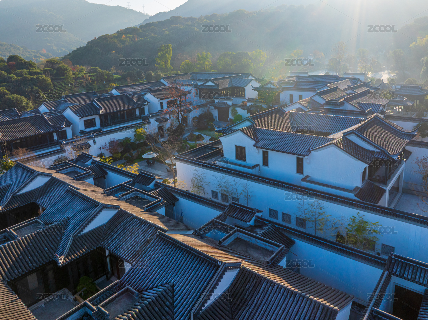 古村清晨,白墙黑瓦映山光