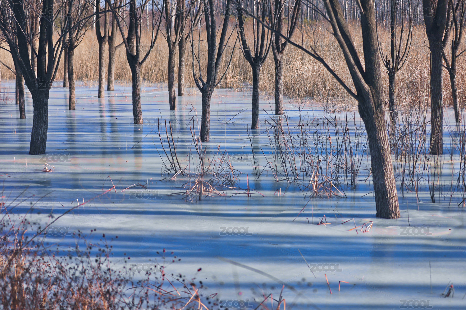 阳光照在树林间,整齐的光影散落在冰面上
