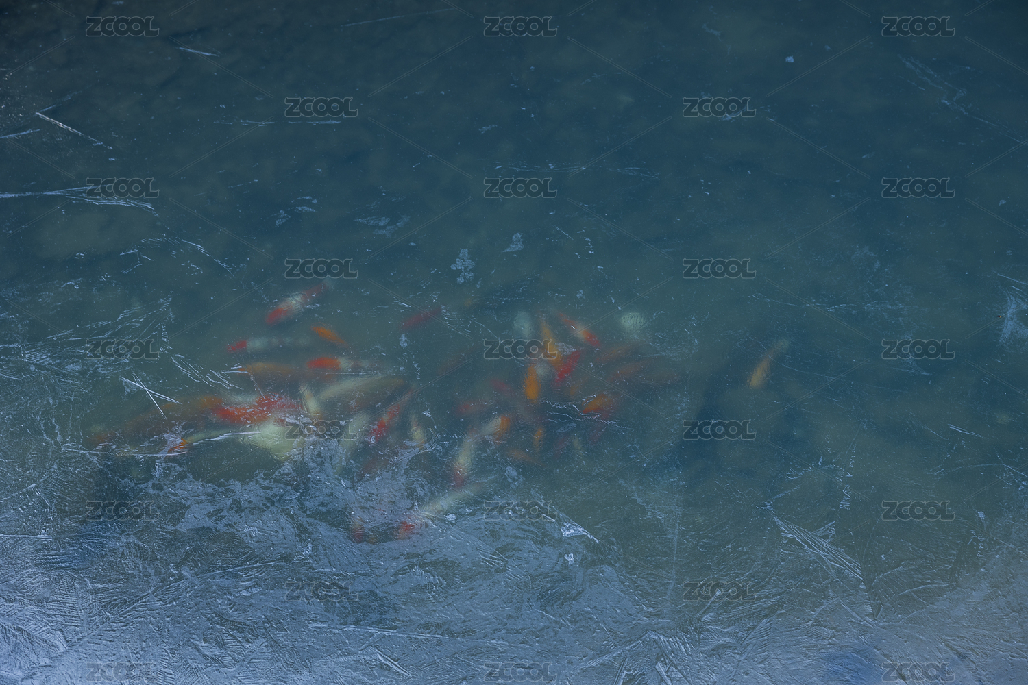 寒冷蓝色河水冰面下的锦鲤跃动