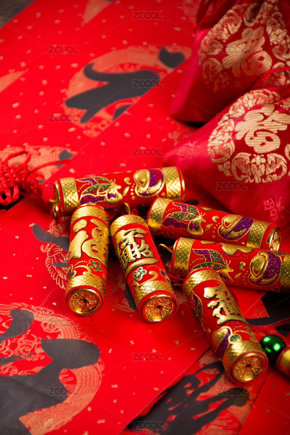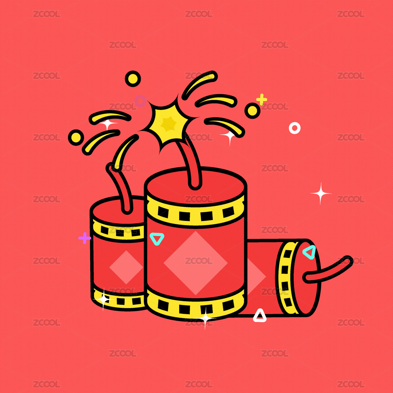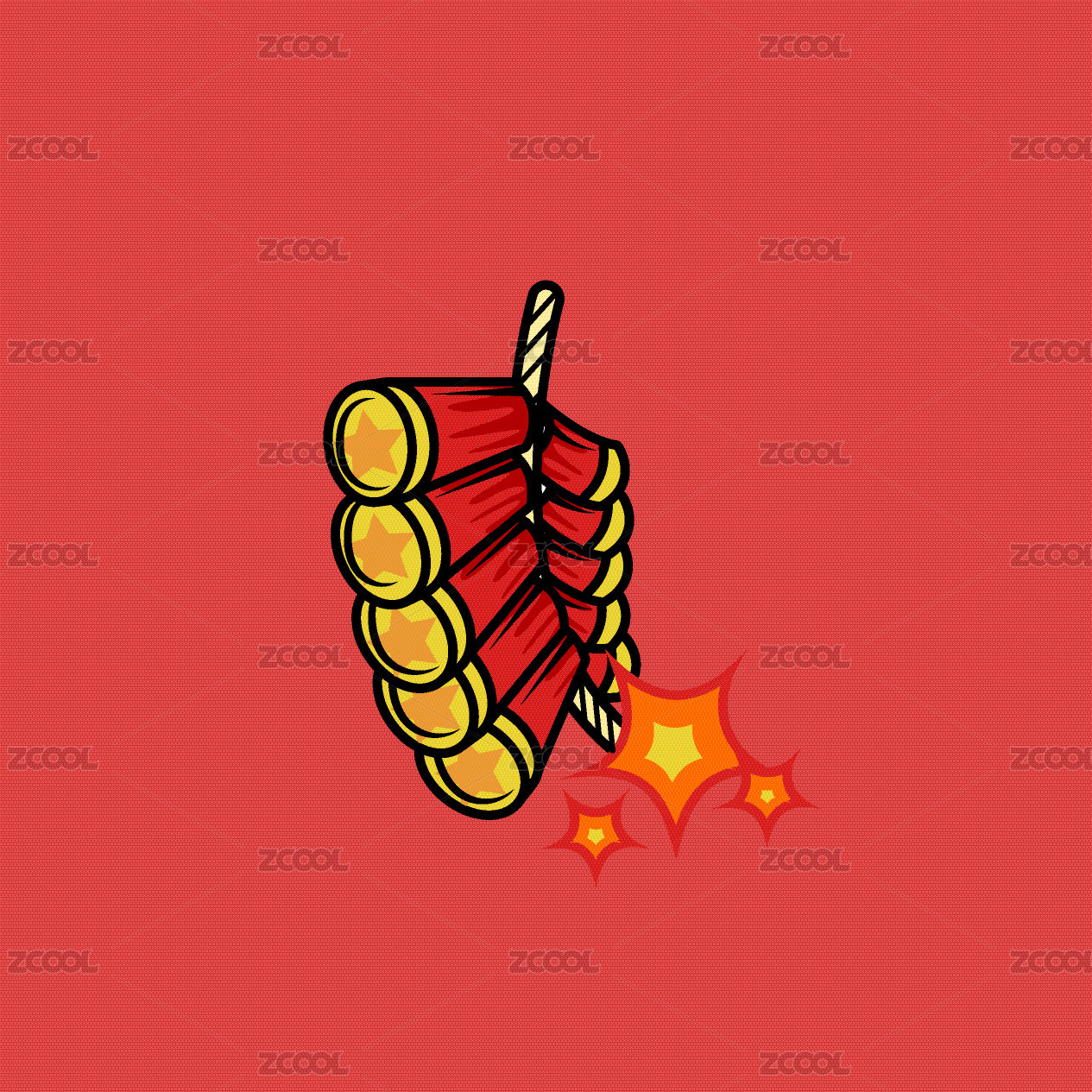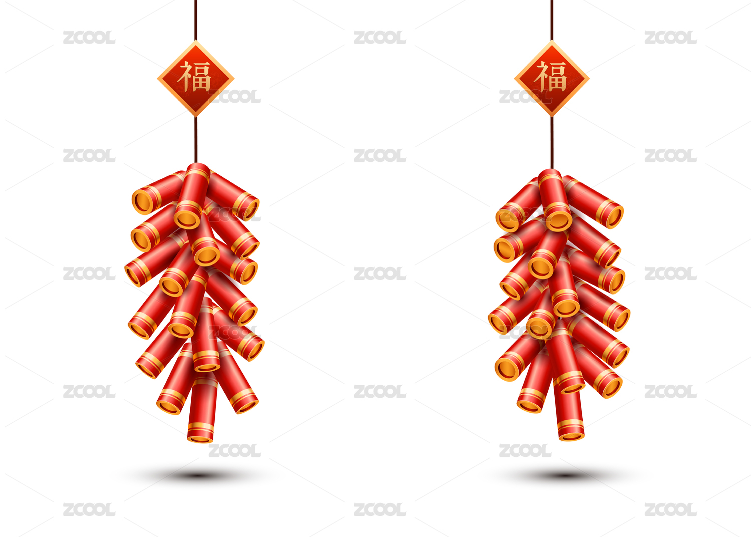 红色背景上两串3D立体鞭炮或炮仗,燃放着的鞭炮和爆竹