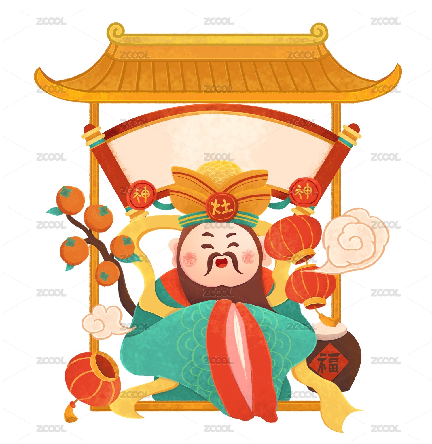 小年灶王爷过新年喜庆矢量剪纸风插画横版