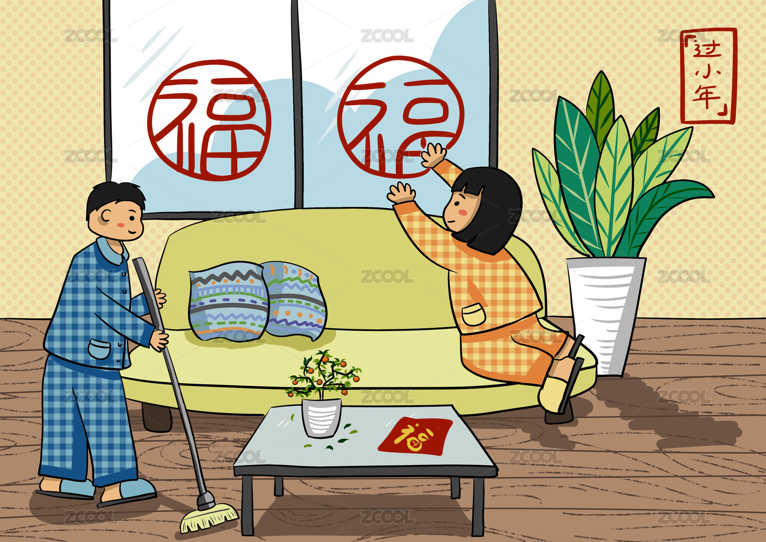 小年家人一起除尘贴福字