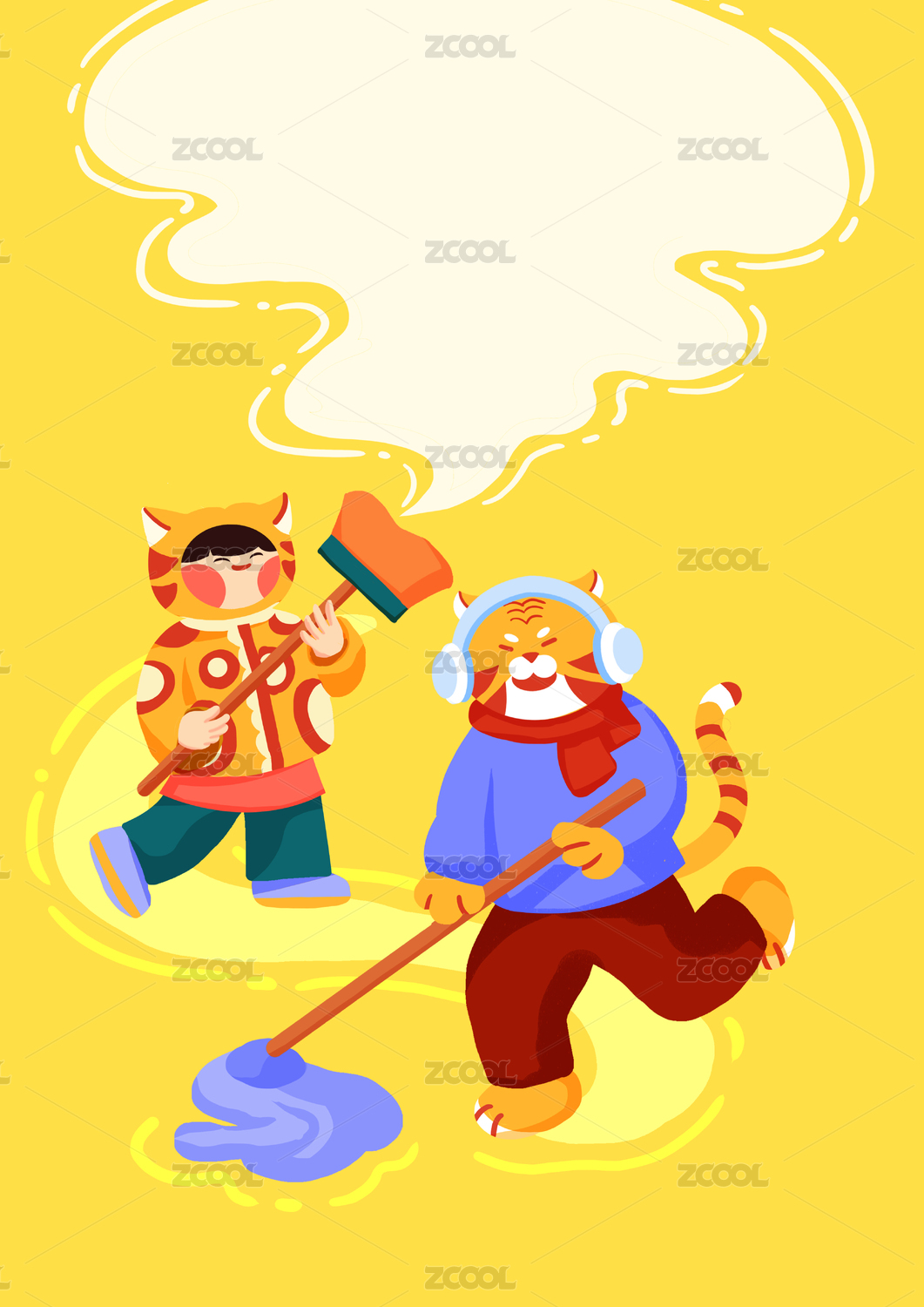 老虎和穿虎头帽衫的女孩过小年扫尘