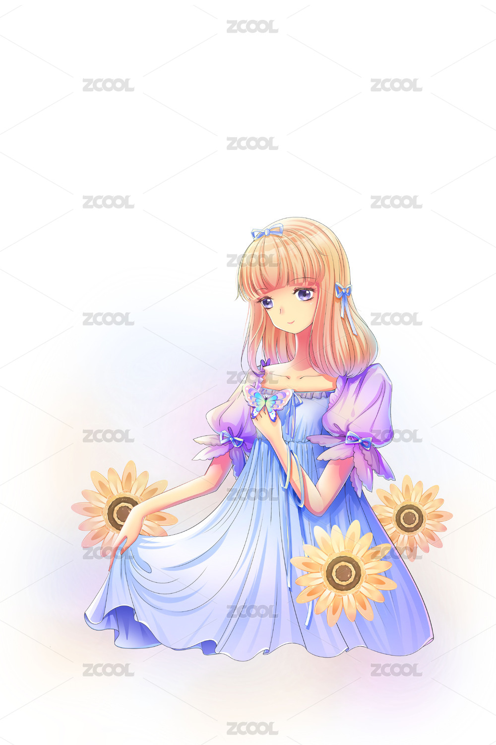 提着裙摆的少女与蝴蝶二次元手绘人物