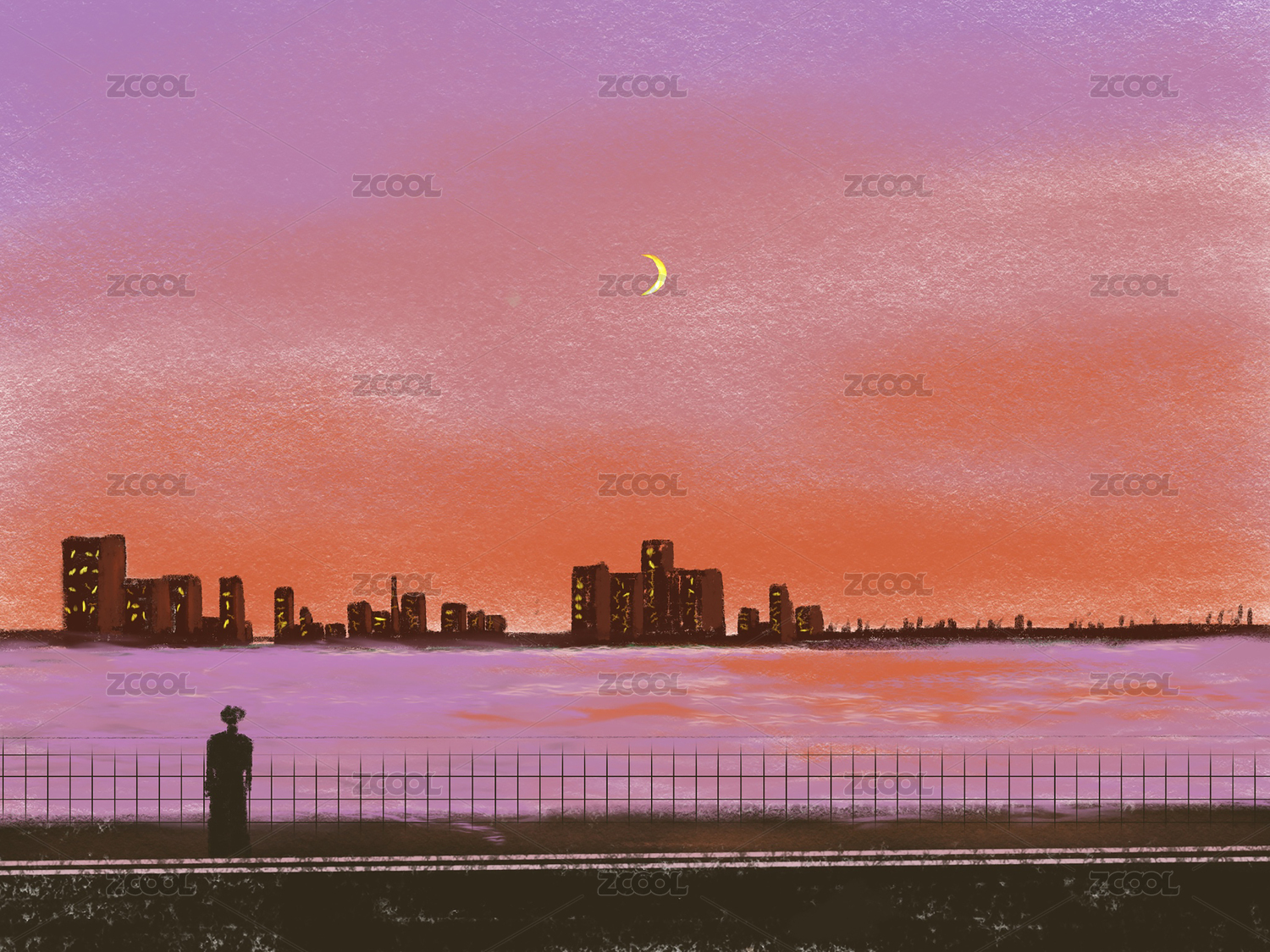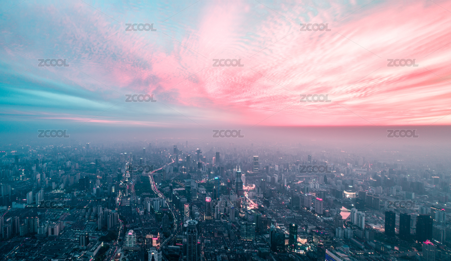 上海浦西延安东路市中心地标建筑群日落火烧云