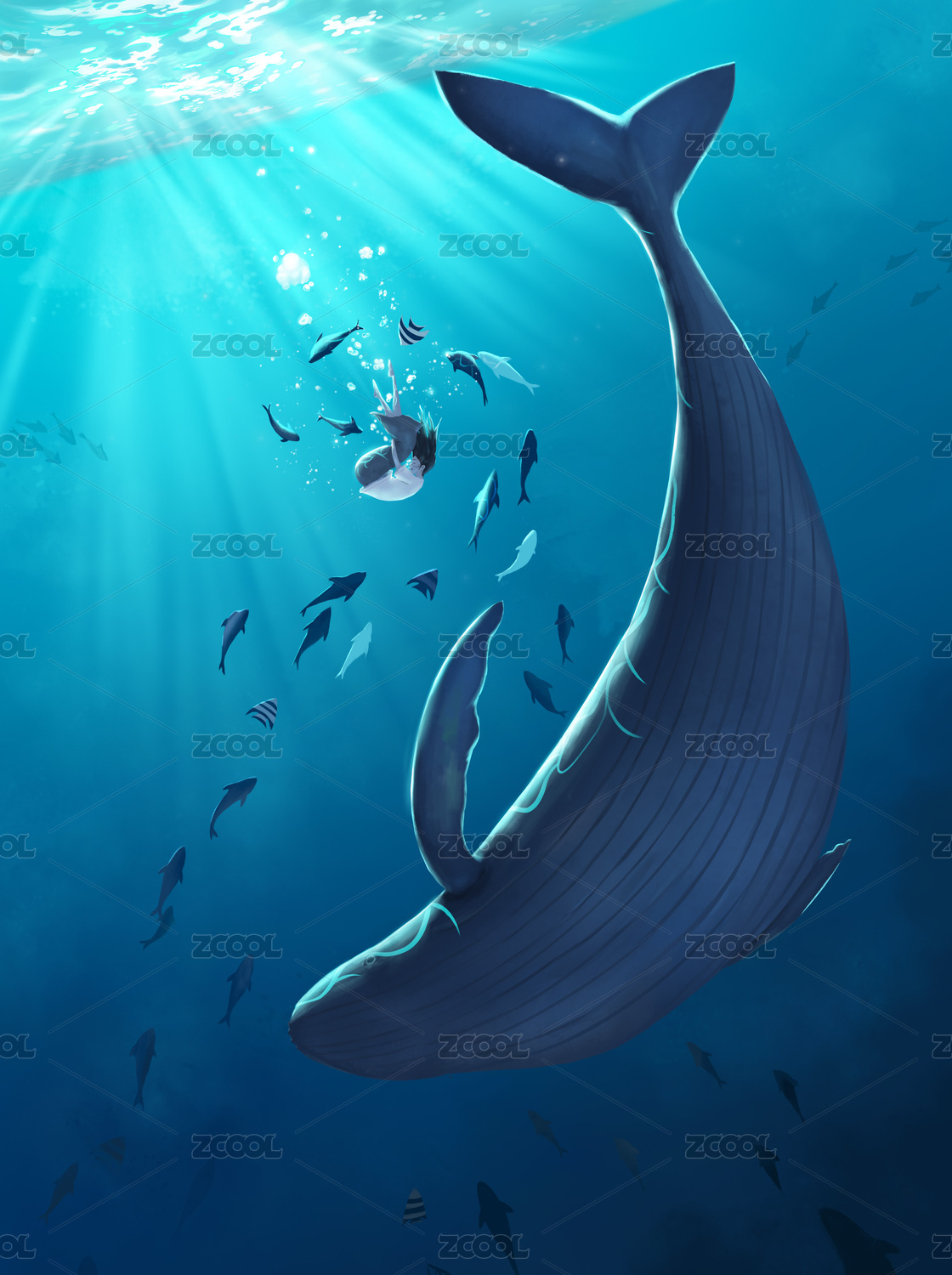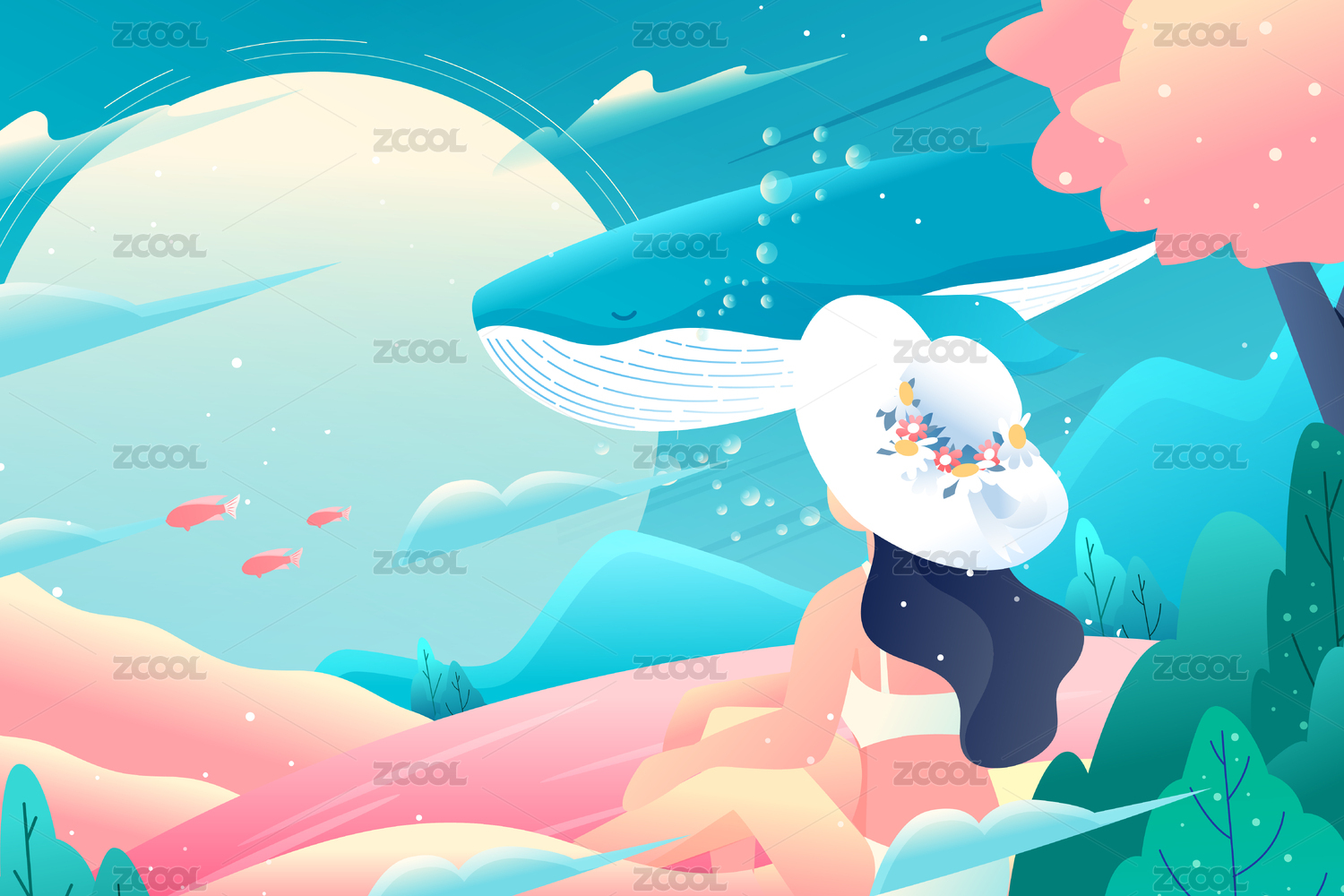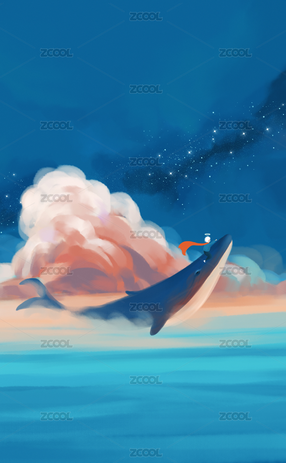 骑着鲸鱼在天际翱翔的女孩 日系小清新插画