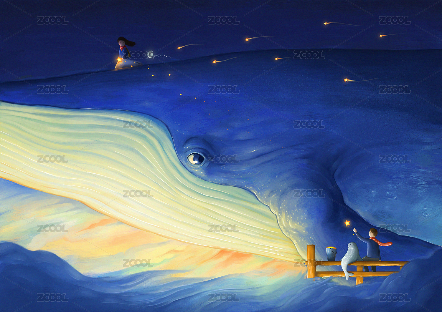 浪漫星空下骑着鲸鱼的男孩治愈系插画横版